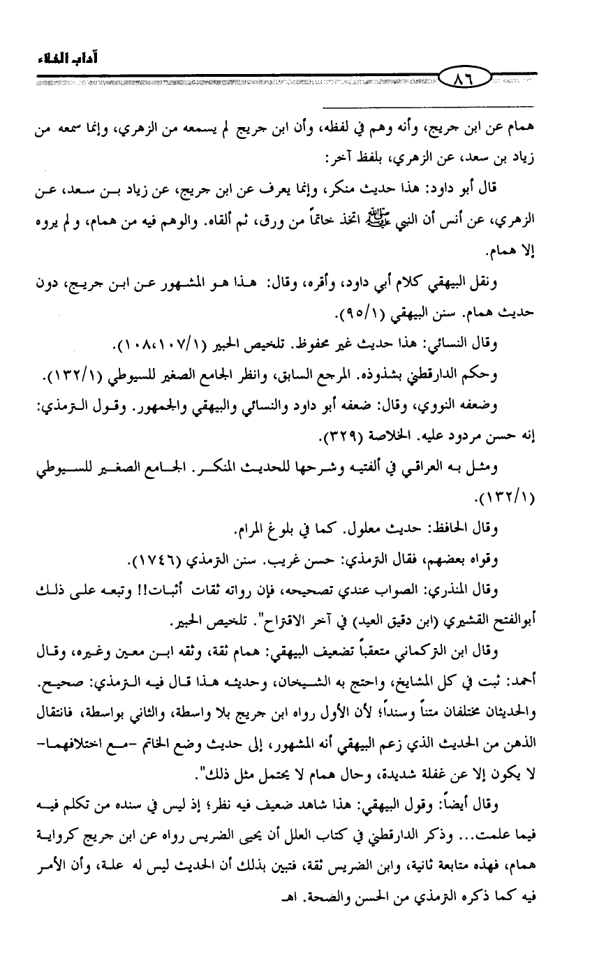 وقال ابن التركماني متعقباً تضعيف البيهقي: همام ثقة، وثقه ابن معين وغيره، وقال أحمد: ثبت في كل المشايخ، واحتج به الشيخان، وحديثه هذا قال فيه الترمذي: صحيح. والحديثان مختلفان متناً وسنداً؛ لأن الأول رواه ابن جريج بلا واسطة، والثاني بواسطة، فانتقال الذهن من الحديث الذي زعم البيهقي أنه المشهور، إلى حديث وضع الخاتم -مع اختلافهما- لا يكون إلا عن غفلة شديدة، وحال همام لا يحتمل مثل ذلك".