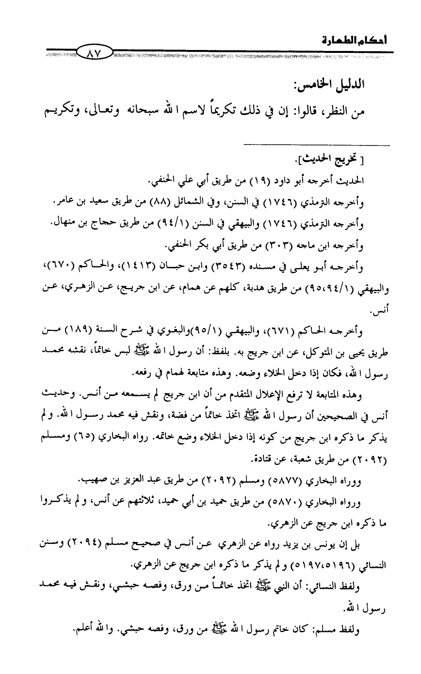 وهذه المتابعة لا ترفع الإعلال المتقدم من أن ابن جريج لم يسمعه من أنس. وحديث أنس في الصحيحين أن رسول الله - صلى الله عليه وسلم - اتخذ خاتماً من فضة، ونقش فيه محمد رسول الله. ولم يذكر ما ذكره ابن جريج من كونه إذا دخل الخلاء وضع خاتمه. رواه البخاري (٦٥) ومسلم (٢٠٩٢) من طريق شعبة، عن قتادة.