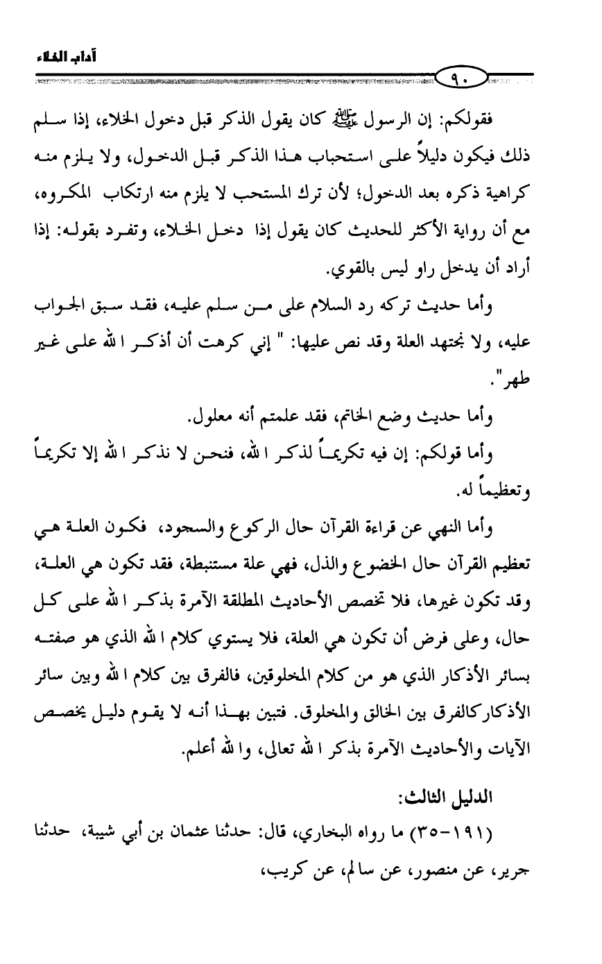 فقولكم: إن الرسول - صلى الله عليه وسلم - كان يقول الذكر قبل دخول الخلاء، إذا سلم ذلك فيكون دليلاً على استحباب هذا الذكر قبل الدخول، ولا يلزم منه كراهية ذكره بعد الدخول؛ لأن ترك المستحب لا يلزم منه ارتكاب المكروه، مع أن رواية الأكثر للحديث كان يقول إذا دخل الخلاء، وتفرد بقوله: إذا أراد أن يدخل راو ليس بالقوي.