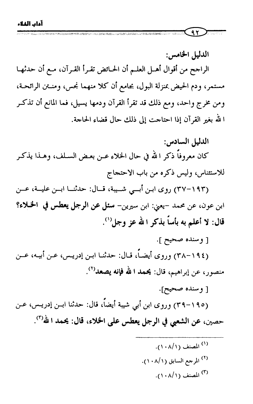 (١٩٣ - ٣٧) روى ابن أبي شيبة، قال: حدثنا ابن علية، عن ابن عون، عن محمد -يعني: ابن سيرين- سئل عن الرجل يعطس في الخلاء؟ قال: لا أعلم به بأساً بذكر الله عز وجل (¬١).