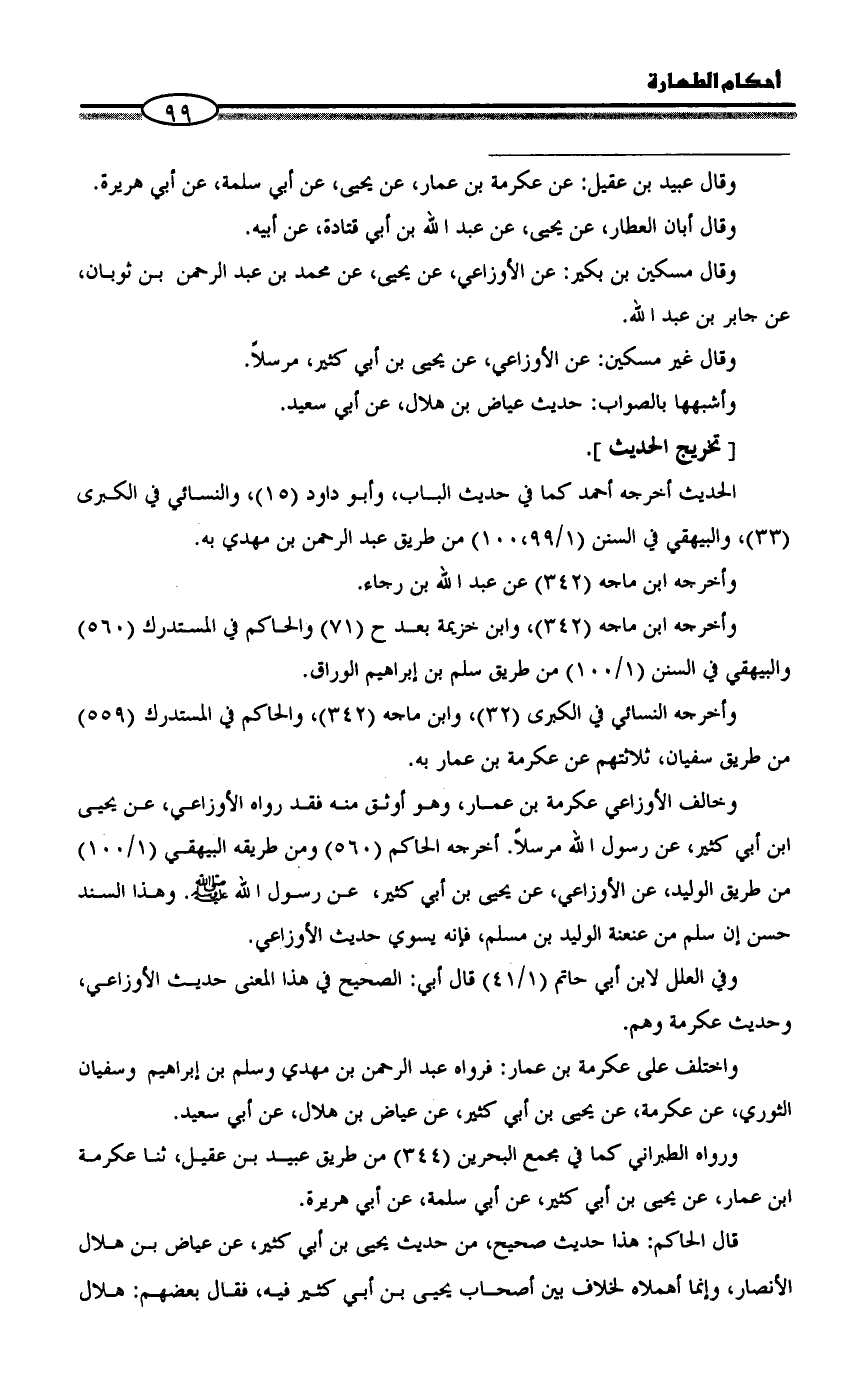 وخالف الأوزاعي عكرمة بن عمار، وهو أوثق منه فقد رواه الأوزاعي، عن يحيى بن أبي كثير، عن رسول الله مرسلاً. أخرجه الحاكم (٥٦٠) ومن طريقه البيهقي (١/ ١٠٠) من طريق الوليد، عن الأوزاعي، عن يحيى بن أبي كثير، عن رسول الله - صلى الله عليه وسلم -. وهذا السند حسن إن سلم من عنعنة الوليد بن مسلم، فإنه يسوي حديث الأوزاعي.