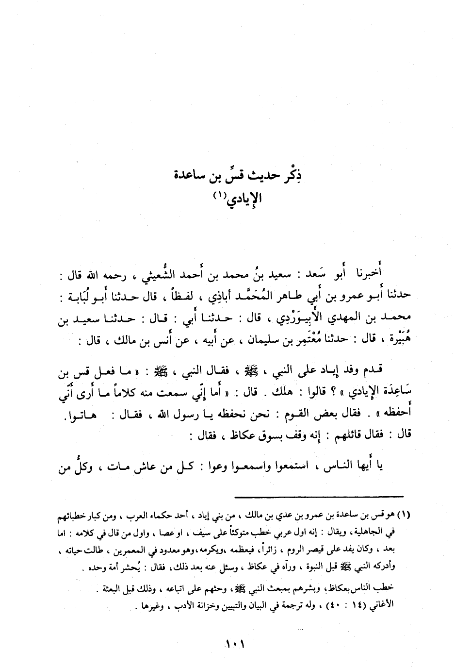 مُحَمَّدُ بْنُ الْمَهْدِيِّ الْأَبِيوَرْدِيُّ، قَالَ: حَدَّثَنَا أَبِي: قَالَ: حَدَّثَنَا سَعِيدُ بْنُ هُبَيْرَةَ، قَالَ: حَدَّثَنَا مُعْتَمِرُ بْنُ سُلَيْمَانَ، عَنْ أَبِيهِ، عَنْ أَنَسِ بْنِ مَالِكٍ، قَالَ: قَدِمَ وَفْدُ إِيَادٍ عَلَى النَّبِيِّ، صَلَّى اللهُ عليه وآله وَسَلَّمَ، فَقَالَ النَّبِيُّ، صَلَّى اللهُ عليه وآله وَسَلَّمَ: «مَا فَعَلَ قُسُّ بْنُ سَاعِدَةَ الْإِيَادِيُّ» ؟ قَالُوا: هَلَكَ. قَالَ: «أَمَا إِنِّي سَمِعْتُ مِنْهُ كَلَامًا مَا أَرَى أَنِّي أَحْفَظُهُ» . فَقَالَ بَعْضُ الْقَوْمِ: نَحْنُ نَحْفَظُهُ يَا رَسُولَ اللهِ، فَقَالَ: هَاتُوا.