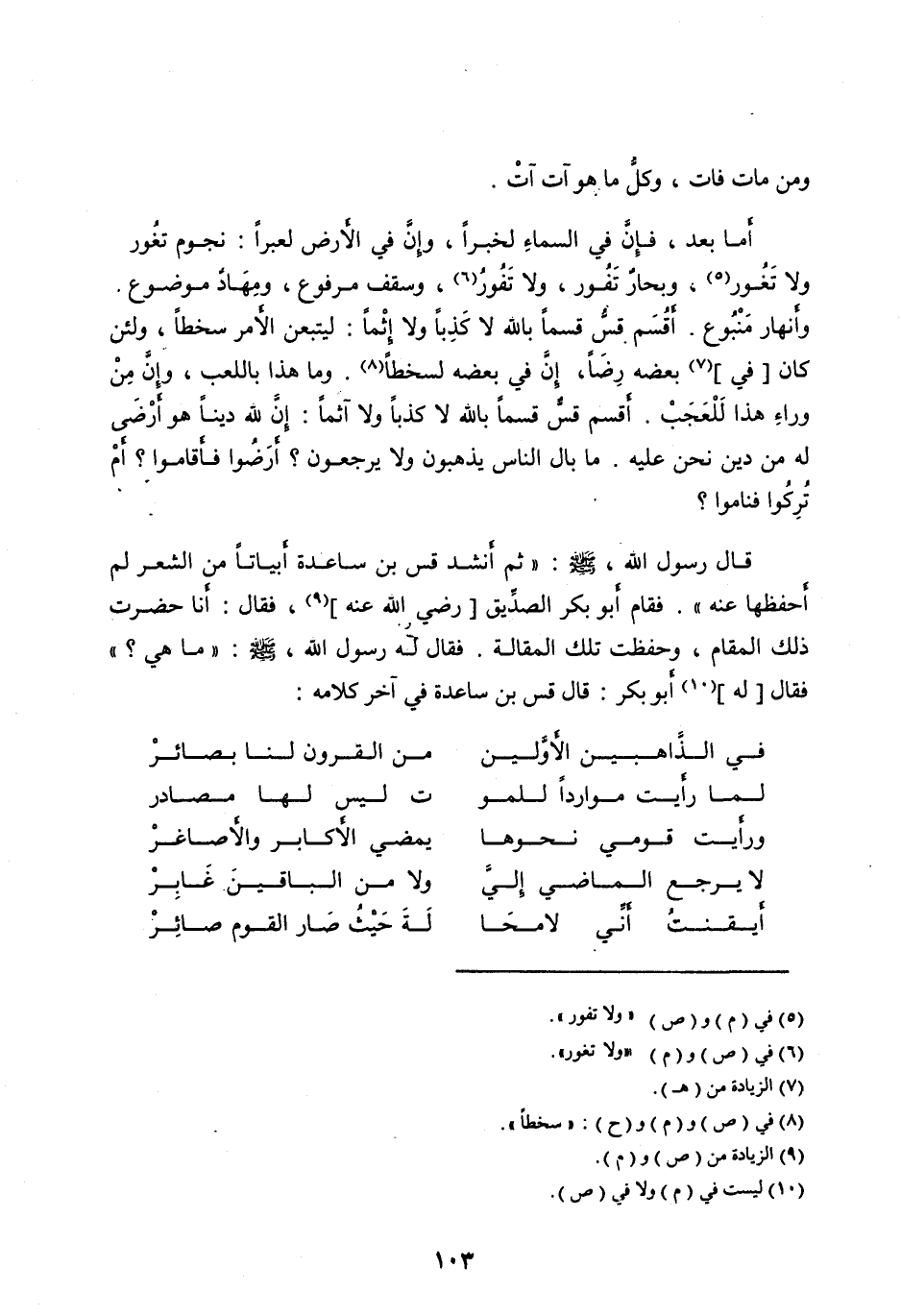 قَالَ رَسُولُ اللهِ، صَلَّى الله عليه وآله وَسَلَّمَ: «ثُمَّ أَنْشَدَ قُسُّ بْنُ سَاعِدَةَ أَبْيَاتًا مِنَ الشِّعْرِ لَمْ أَحْفَظْهَا عَنْهُ» . فَقَامَ أَبُو بَكْرٍ الصِّدِّيقُ [رَضِيَ اللهُ عَنْهُ] [ (9) ] ، فَقَالَ: أَنَا حَضَرْتُ ذَلِكَ الْمَقَامَ، وَحَفِظْتُ تِلْكَ الْمَقَالَةَ. فَقَالَ لَهُ رَسُولُ اللهِ، صَلَّى اللهُ عَلَيْهِ وآله وَسَلَّمَ: «مَا هِيَ؟» فَقَالَ [لَهُ] [ (10) ] أَبُو بَكْرٍ: قَالَ قُسُّ بْنُ سَاعِدَةَ فِي آخر كلامه: