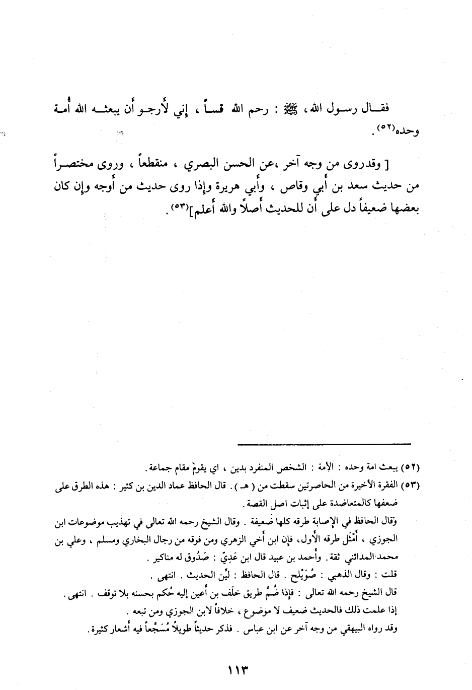 فَقَالَ رَسُولُ اللهِ، صَلَّى الله عليه وآله وَسَلَّمَ: رَحِمَ اللهُ قُسًّا، إِنِّي لَأَرْجُو أَنْ يَبْعَثَهُ اللهُ أُمَّةً وَحْدَهُ [ (52) ] .