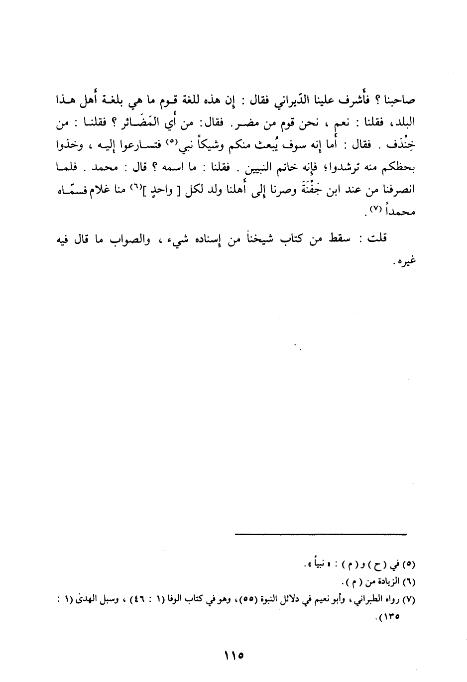 [ (7) ] رواه الطبراني، وأبو نعيم في دلائل النبوة (55) ، وهو في كتاب الوفا (1: 46) ، وسبل الهدى (1: