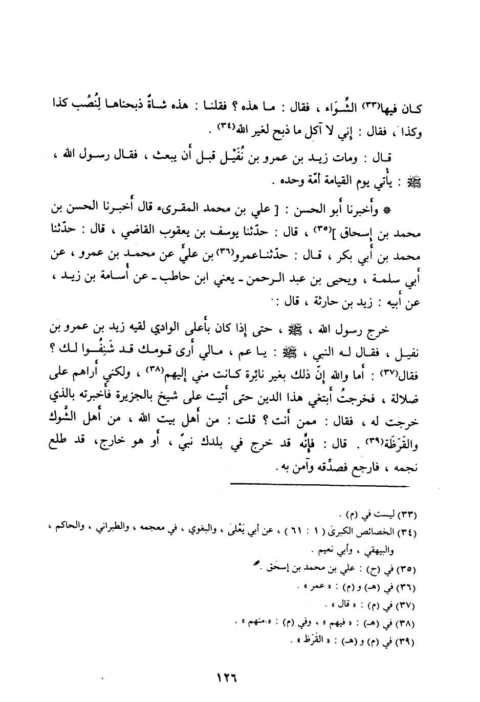 * وأَخْبَرَنَا أَبُو الْحَسَنِ: [عَلِيُّ بْنُ مُحَمَّدٍ الْمُقْرِئُ قَالَ أَخْبَرَنَا الْحَسَنُ بْنُ مُحَمَّدِ بْنِ إِسْحَاقَ] [ (35) ] ، قَالَ: حَدَّثَنَا يُوسُفُ بْنُ يَعْقُوبَ الْقَاضِي، قَالَ: حَدَّثَنَا مُحَمَّدُ بْنُ أَبِي بَكْرٍ، قَالَ: حَدَّثَنَا عَمْرُو [ (36) ] بْنُ عَلِيٍّ عَنْ مُحَمَّدِ بْنِ عَمْرٍو، عَنْ أَبِي سَلَمَةَ، وَيَحْيَى بْنِ عَبْدِ الرَّحْمَنِ- يَعْنِي ابْنَ حَاطِبٍ- عَنْ أُسَامَةَ بْنِ زَيْدٍ، عَنْ أَبِيهِ: زَيْدِ بْنِ حَارِثَةَ، قَالَ: خَرَجَ رَسُولُ اللهِ، صَلَّى اللهُ عَلَيْهِ وآله وَسَلَّمَ، حَتَّى إِذَا كَانَ بِأَعْلَى الْوَادِي لَقِيَهُ زَيْدُ بْنُ عَمْرِو بْنِ نُفَيْلٍ، فَقَالَ لَهُ النَّبِيُّ، صَلَّى الله عليه وآله وَسَلَّمَ: يَا عَمِّ، مَالِي أَرَى قَوْمَكَ قَدْ شَنِفُوا لَكَ؟