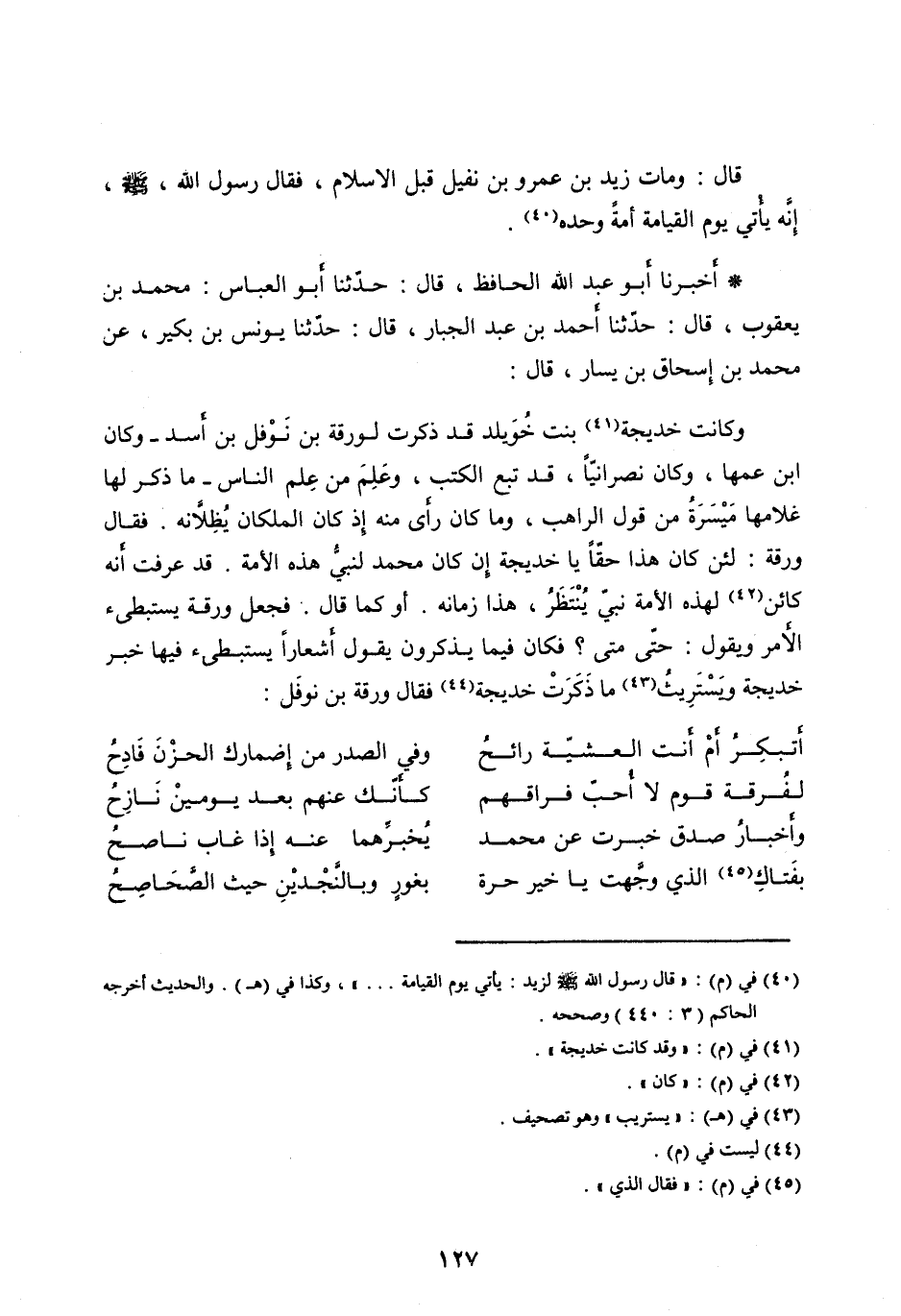 قَالَ: وَمَاتَ زَيْدُ بْنُ عَمْرِو بْنِ نُفَيْلٍ قَبْلَ الْإِسْلَامِ، فَقَالَ رَسُولُ اللهِ، صَلَّى الله عليه وآله وَسَلَّمَ، إِنَّهُ يَأْتِي يَوْمَ الْقِيَامَةِ أُمَّةً وَحْدَهُ [ (40) ] .