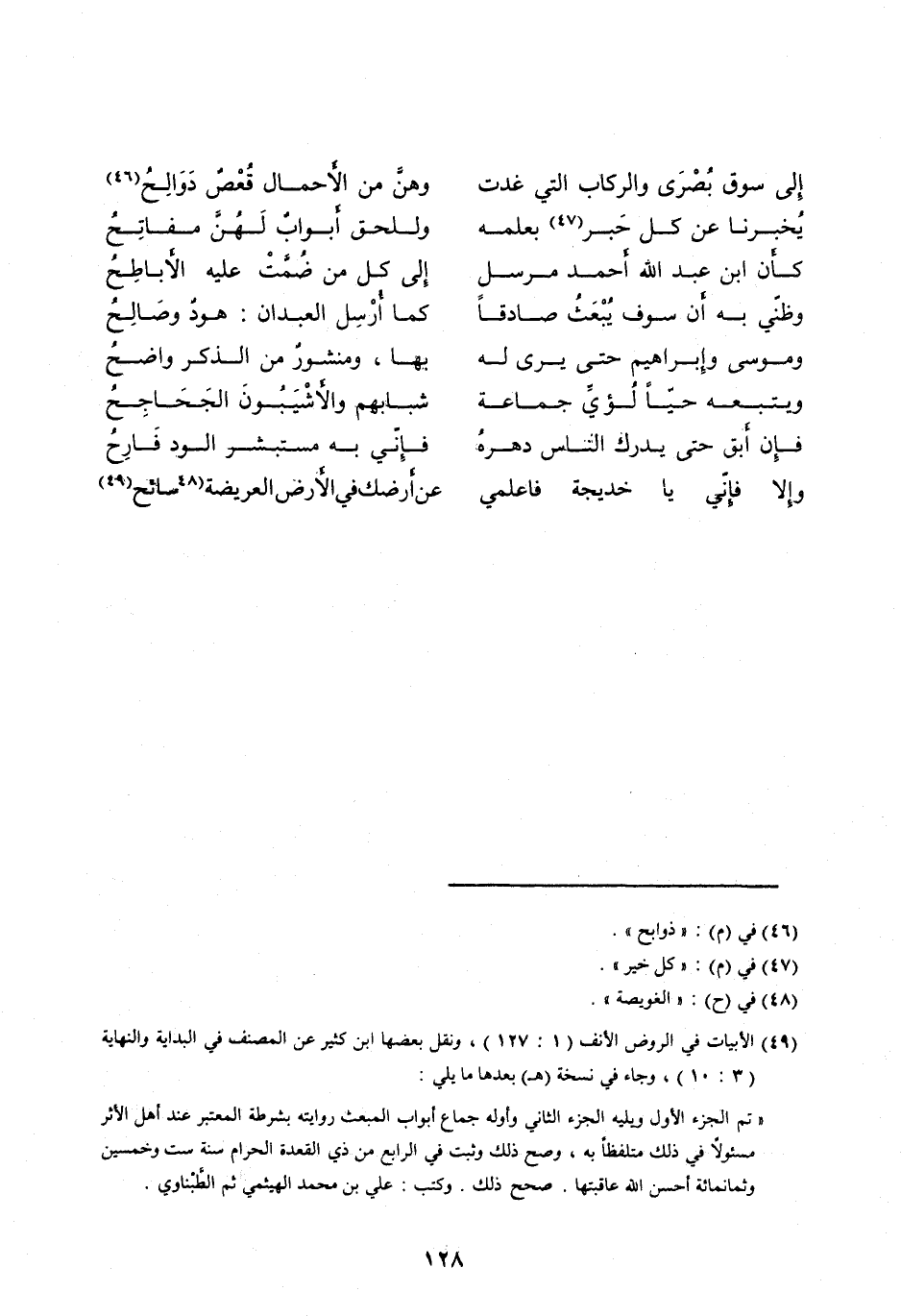 [ (49) ] الأبيات في الروض الأنف (1: 127) ، ونقل بعضها ابن كثير عن المصنف في البداية والنهاية (3: 10) ، وجاء في نسخة (هـ) بعدها ما يلي: