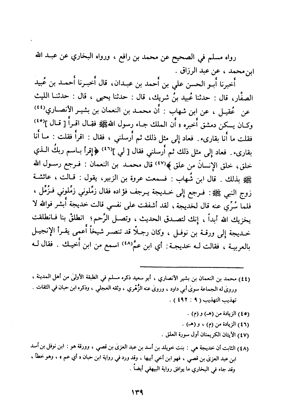 أَخْبَرَنَا أَبُو الْحَسَنِ عَلِيُّ بْنُ أَحْمَدَ بْنِ عَبْدَانَ، قَالَ أَخْبَرَنَا أَحْمَدُ بْنُ عُبَيْدٍ الصَّفَّارُ، قَالَ: حَدَّثَنَا عُبَيْدُ بْنُ شَرِيكٍ، قَالَ: حَدَّثَنَا يَحْيَى، قَالَ: حَدَّثَنَا اللَّيْثُ، عَنْ عُقَيْلٍ، عَنِ ابْنِ شِهَابٍ: أَنَّ مُحَمَّدَ بْنَ النُّعْمَانِ بْنِ بَشِيرٍ الْأَنْصَارِيَّ [ (44) ] وَكَانَ يَسْكُنُ دِمَشْقَ أَخْبَرَهُ «أَنَّ الْمَلَكَ جَاءَ رَسُولَ اللهِ صَلَّى الله عليه وآله وَسَلَّمَ فَقَالَ اقْرَأْ [قَالَ] [ (45) ] فَقُلْتُ مَا أَنَا بِقَارِئٍ. فَعَادَ إِلَى مِثْلِ ذَلِكَ ثُمَّ أَرْسَلَنِي، فَقَالَ: اقْرَأْ فَقُلْتُ: مَا أَنَا بِقَارِئٍ. فَعَادَ إِلَى مِثْلِ ذَلِكَ ثُمَّ أَرْسَلَنِي فَقَالَ [لِي] [ (46) ] اقْرَأْ بِاسْمِ رَبِّكَ الَّذِي خَلَقَ، خَلَقَ الْإِنْسانَ مِنْ عَلَقٍ [ (47) ] قَالَ مُحَمَّدُ بْنُ النُّعْمَانِ: فَرَجَعَ رَسُولُ اللهِ صَلَّى الله عليه وآله وَسَلَّمَ بِذَلِكَ. قَالَ ابْنُ شِهَابٍ: فَسَمِعْتُ عُرْوَةَ بْنَ الزُّبَيْرِ، يَقُولُ: قَالَتْ، عَائِشَةُ زَوْجِ النَّبِيِّ صَلَّى الله عليه وآله وَسَلَّمَ: فَرَجَعَ إِلَى خَدِيجَةَ يَرْجُفُ فُؤَادُهُ فَقَالَ زَمِّلُونِي زَمِّلُونِي فَزُمِّلَ، فَلَمَّا سُرِّيَ عَنْهُ قَالَ لِخَدِيجَةَ، لَقَدْ أَشْفَقْتُ عَلَى نَفْسِي قَالَتْ خَدِيجَةُ أَبْشِرْ فو الله لَا يُخْزِيكَ اللهُ أَبَدًا، إِنَّكَ لَتَصْدُقُ الْحَدِيثَ، وَتَصِلُ الرَّحِمَ، انْطَلِقْ بِنَا فَانْطَلَقَتْ خَدِيجَةُ إِلَى وَرَقَةَ بْنِ نَوْفَلٍ، وَكَانَ رَجُلًا قَدْ تَنَصَّرَ شَيْخًا أَعْمَى يَقْرَأُ الْإِنْجِيلَ بِالْعَرَبِيَّةِ، فَقَالَتْ لَهُ خَدِيجَةُ: أَيِ ابْنَ عَمٍّ [ (48) ] اسْمَعْ مِنِ ابْنِ أَخِيكَ. فَقَالَ لَهُ