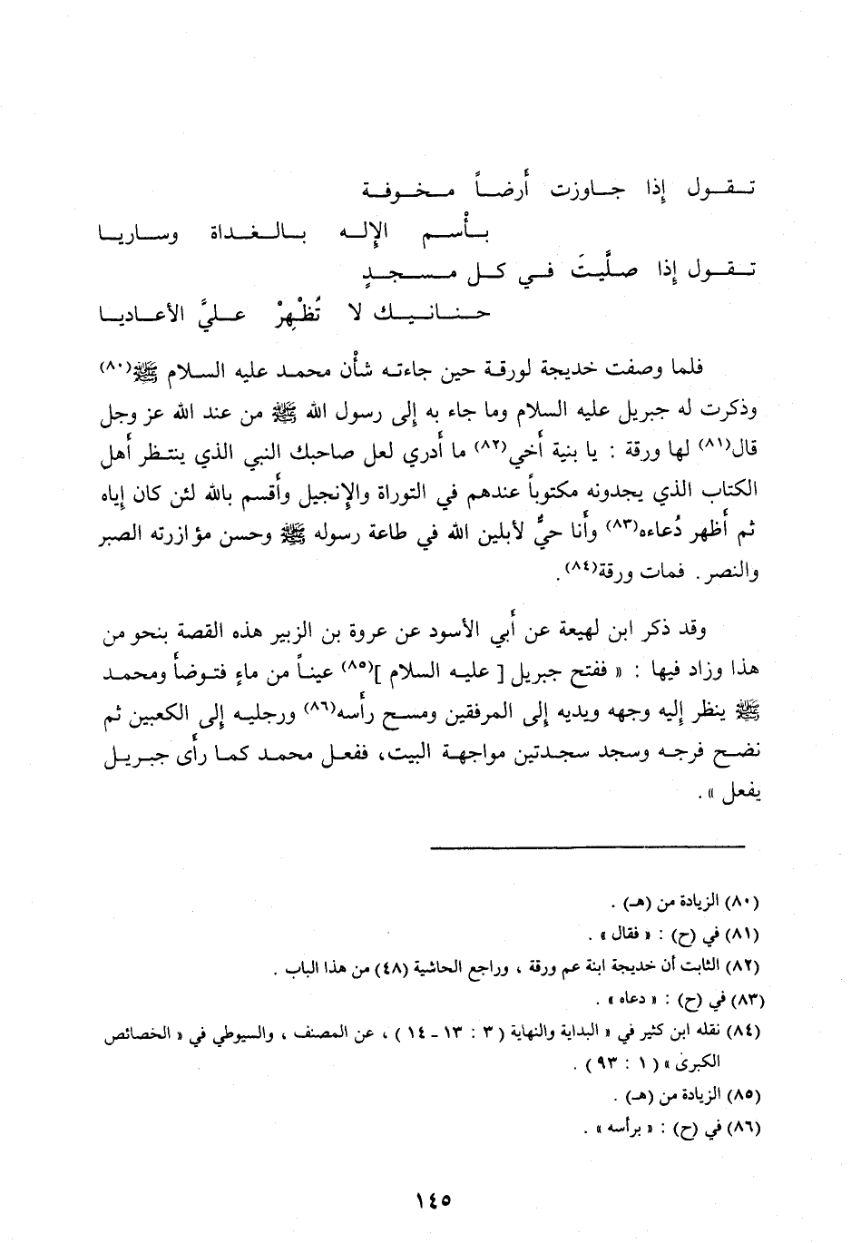فَلَمَّا وَصَفَتْ خَدِيجَةُ لِوَرَقَةَ حِينَ جَاءَتْهُ شَأْنَ مُحَمَّدٍ عليه السلام صلّى الله عليه وآله وَسَلَّمَ [ (80) ] وَذَكَرَتْ لَهُ جِبْرِيلَ عَلَيْهِ السَّلَامُ وَمَا جَاءَ بِهِ إِلَى رَسُولِ اللهِ صَلَّى اللهُ عَلَيْهِ وآله وَسَلَّمَ مِنْ عِنْدِ اللهِ عَزَّ وَجَلَّ قَالَ [ (81) ] لَهَا وَرَقَةُ: يَا بُنَيَّةَ أَخِي [ (82) ] مَا أَدْرِي لَعَلَّ صَاحِبَكِ النَّبِيُّ الَّذِي يَنْتَظِرُ أَهْلُ الْكِتَابِ الَّذِي يَجِدُونَهُ مَكْتُوبًا عِنْدَهُمْ فِي التَّوْرَاةِ وَالْإِنْجِيلِ وَأُقْسِمُ بِاللهِ لَئِنْ كَانَ إِيَّاهُ ثُمَّ أَظْهَرَ دُعَاءَهُ [ (83) ] وَأَنَا حَيٌّ لَأُبْلِيَنَّ اللهَ فِي طَاعَةِ رَسُولِهِ صَلَّى الله عليه وآله وَسَلَّمَ وَحُسْنِ مُؤَازَرَتِهِ الصَّبْرَ وَالنَّصْرَ. فَمَاتَ وَرَقَةُ [ (84) ] .