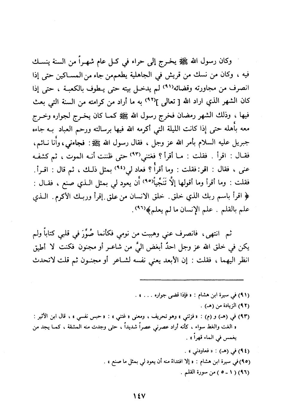 وَكَانَ رَسُولُ اللهِ صَلَّى الله عليه وآله وَسَلَّمَ يَخْرُجُ إِلَى حِرَاءَ فِي كُلِّ عَامٍ شَهْرًا مِنَ السَّنَةِ يَنْسُكُ فِيهِ، وَكَانَ مَنْ نَسَكَ مِنْ قُرَيْشٍ فِي الْجَاهِلِيَّةِ يُطْعِمُ مَنْ جَاءَ مِنَ الْمَسَاكِينِ حَتَّى إِذَا انْصَرَفَ مِنْ مُجَاوَرَتِهِ وَقَضَائِهِ [ (91) ] لَمْ يَدْخُلْ بَيْتَهُ حَتَّى يَطُوفَ بِالْكَعْبَةِ، حَتَّى إِذَا كَانَ الشَّهْرُ الَّذِي أَرَادَ اللهُ [تَعَالَى] [ (92) ] بِهِ مَا أَرَادَ مِنْ كَرَامَتِهِ مِنَ السَّنَةِ الَّتِي بُعِثَ فِيهَا، وَذَلِكَ الشَّهْرُ رَمَضَانُ فَخَرَجَ رَسُولُ اللهِ صَلَّى اللهُ عليه وآله وَسَلَّمَ كَمَا كَانَ يَخْرُجُ لِجِوَارِهِ وَخَرَجَ مَعَهُ بِأَهْلِهِ حَتَّى إِذَا كَانَتِ اللَّيْلَةُ الَّتِي أَكْرَمَهُ اللهُ فِيهَا بِرِسَالَتِهِ وَرَحِمَ الْعِبَادَ بِهِ جَاءَهُ جِبْرِيلُ عَلَيْهِ السَّلَامُ بِأَمْرِ اللهِ عَزَّ وَجَلَّ، فَقَالَ رَسُولُ اللهِ صَلَّى الله عليه وآله وَسَلَّمَ: فَجَاءَنِي، وَأَنَا نَائِمٌ، فَقَالَ: اقْرَأْ. فَقُلْتُ: مَا أَقْرَأُ؟ فَغَتَّنِي [ (93) ] حَتَّى ظَنَنْتُ أَنَّهُ الْمَوْتُ، ثُمَّ كَشَفَهُ عَنِّي، فقال: أقر: فَقُلْتُ: وَمَا أَقْرَأُ؟ فَعَادَ لِي [ (94) ] بِمِثْلِ ذَلِكَ، ثُمَّ قَالَ: اقْرَأْ.