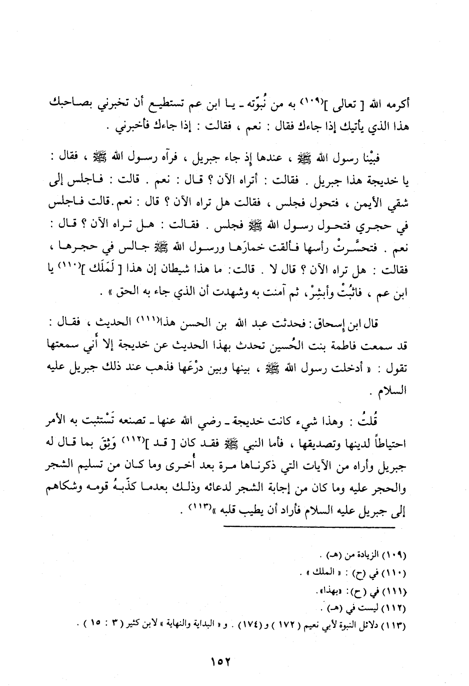 قُلْتُ: وَهَذَا شَيْءٌ كَانَتْ خَدِيجَةُ- رَضِيَ اللهُ عَنْهَا- تَصْنَعُهُ تَسْتَثْبِتُ بِهِ الْأَمْرَ احْتِيَاطًا لِدِينِهَا وَتَصْدِيقِهَا، فَأَمَّا النَّبِيُّ صَلَّى الله عليه وآله وَسَلَّمَ فَقَدْ كَانَ [قَدْ] [ (112) ] وَثِقَ بِمَا قَالَ لَهُ جِبْرِيلُ وَأَرَاهُ مِنَ الْآيَاتِ الَّتِي ذَكَرْنَاهَا مَرَّةً بَعْدَ أُخْرَى وَمَا كَانَ مِنْ تَسْلِيمِ الشَّجَرِ وَالْحَجَرِ عَلَيْهِ وَمَا كَانَ مِنْ إِجَابَةِ الشجر لدعائه وذلك بعد ما كَذَّبَهُ قَوْمُهُ وَشَكَاهُمْ إِلَى جِبْرِيلَ عَلَيْهِ السَّلَامُ فَأَرَادَ أَنْ يُطَيِّبَ قلبه» [ (113) ] .
