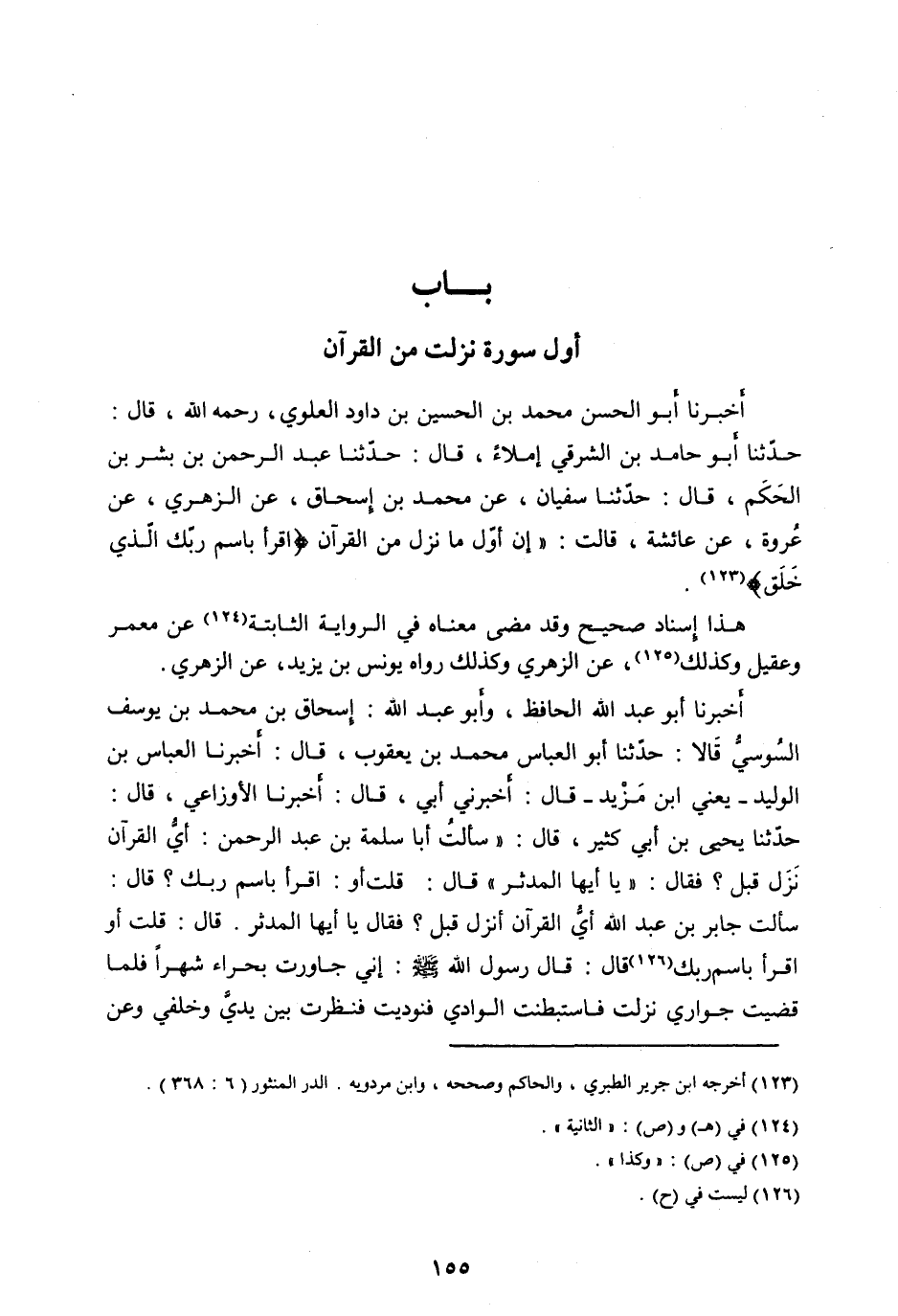 سَأَلْتُ جَابِرَ بْنَ عَبْدِ اللهِ أَيُّ الْقُرْآنِ أُنْزِلَ قَبْلُ؟ فَقَالَ يَا أَيُّهَا الْمُدَّثِّرُ. قَالَ: قُلْتُ أَوِ اقْرَأْ بِاسْمِ رَبِّكَ [ (126) ] قَالَ: قَالَ رَسُولُ اللهِ صَلَّى اللهُ عَلَيْهِ وآله وَسَلَّمَ: إِنِّي جَاوَرْتُ بِحِرَاءَ شَهْرًا فَلَمَّا قَضَيْتُ جِوَارِي نَزَلْتُ فَاسْتَبْطَنْتُ الْوَادِيَ فَنُودِيتُ فَنَظَرْتُ بَيْنَ يَدَيَّ وَخَلْفِي وعن