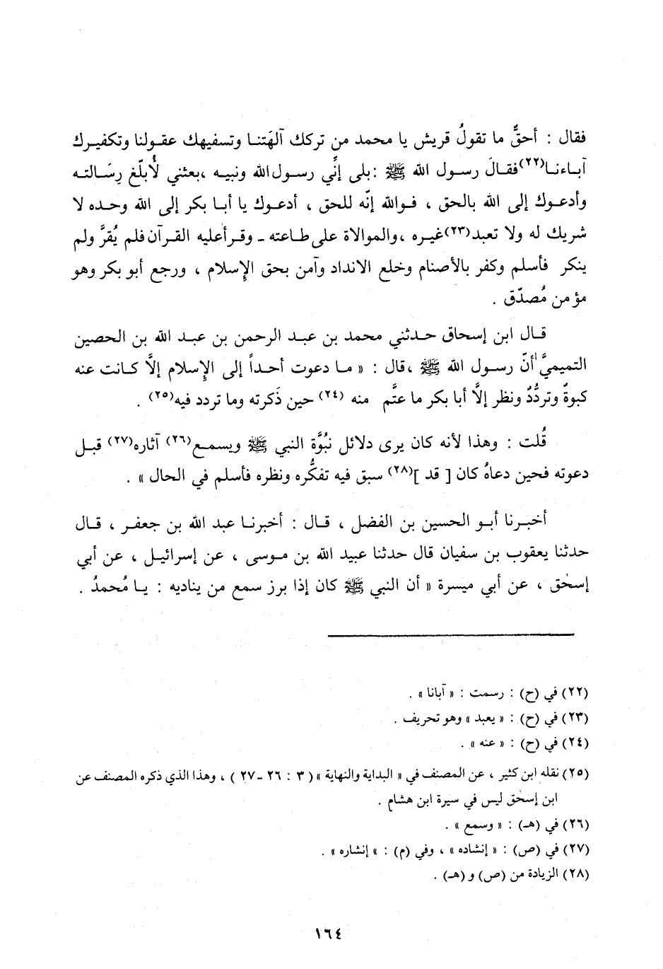 قَالَ ابْنُ إِسْحَاقَ حَدَّثَنِي مُحَمَّدُ بْنُ عَبْدِ الرَّحْمَنِ بْنِ عَبْدِ اللهِ بْنِ الْحُصَيْنِ التَّمِيمِيُّ أَنَّ رَسُولَ اللهِ صَلَّى اللهُ عليه وآله وَسَلَّمَ، قَالَ: «مَا دَعَوْتُ أَحَدًا إِلَى الْإِسْلَامِ إِلَّا كَانَتْ عَنْهُ كَبْوَةٌ وَتَرَدُّدٌ وَنَظَرٌ إِلَّا أَبَا بَكْرٍ مَا عَتَّمَ مِنْهُ [ (24) ] حِينَ ذَكَرْتُهُ وَمَا تَرَدَّدَ فِيهِ [ (25) ] .