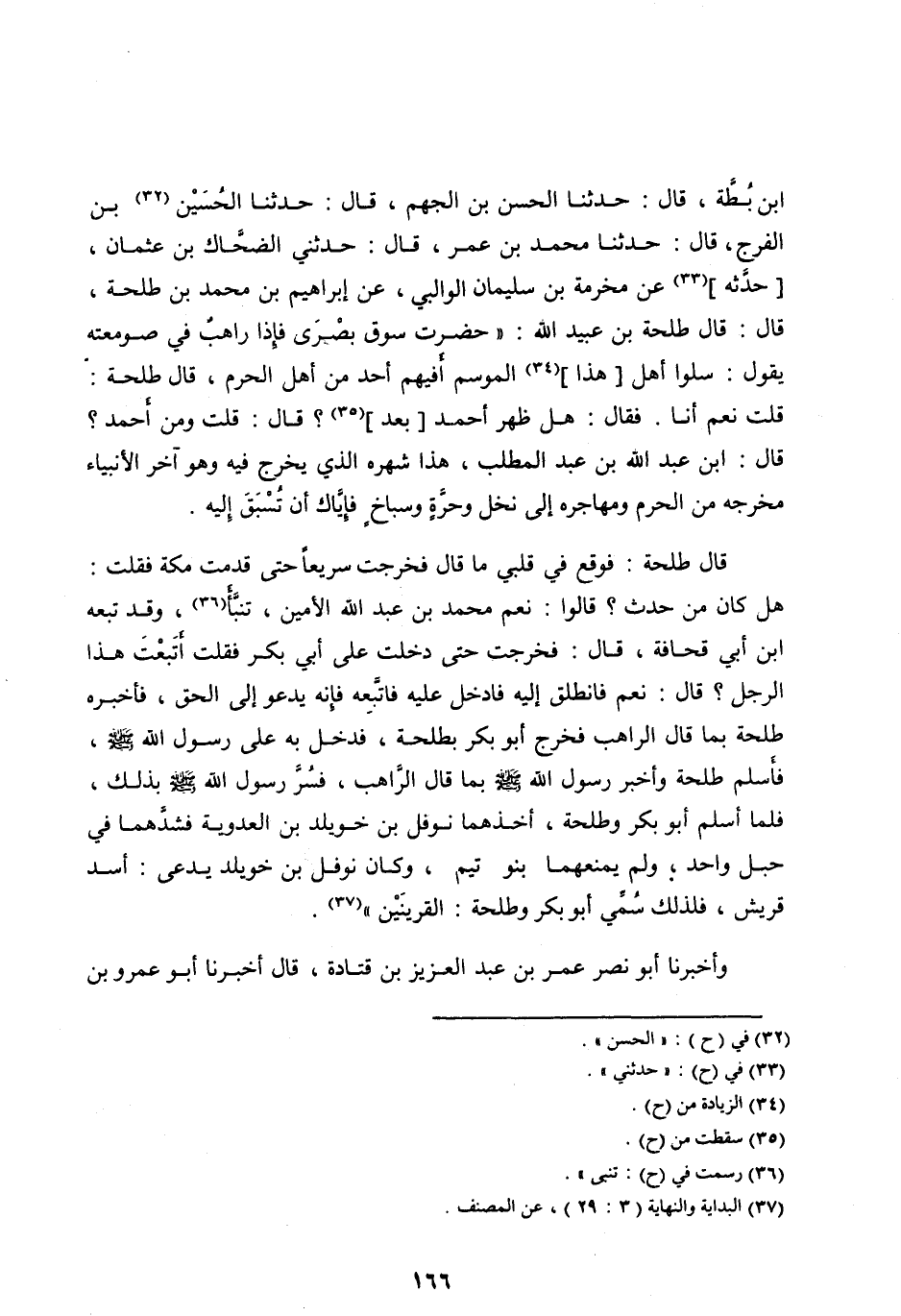 هَلْ كَانَ مِنْ حَدَثٍ؟ قَالُوا: نَعَمْ مُحَمَّدُ بْنُ عَبْدِ اللهِ الْأَمِينُ، تَنَبَّأَ [ (36) ] ، وَقَدْ تَبِعَهُ ابْنُ أَبِي قُحَافَةَ، قَالَ: فَخَرَجْتُ حَتَّى دَخَلْتُ عَلَى أَبِي بَكْرٍ فَقُلْتُ أَتَبِعْتَ هَذَا الرَّجُلَ؟ قَالَ: نَعَمْ فَانْطَلِقْ إِلَيْهِ فَادْخُلْ عَلَيْهِ فَاتَّبِعْهُ فَإِنَّهُ يَدْعُو إِلَى الْحَقِّ، فَأَخْبَرَهُ طَلْحَةُ بِمَا قَالَ الرَّاهِبُ فَخَرَجَ أَبُو بَكْرٍ بِطَلْحَةَ، فَدَخَلَ بِهِ عَلَى رَسُولِ اللهِ صَلَّى اللهُ عَلَيْهِ وآله وَسَلَّمَ، فَأَسْلَمَ طَلْحَةُ وَأَخْبَرَ رسول الله صلى الله عليه وآله وَسَلَّمَ بِمَا قَالَ الرَّاهِبُ، فَسَّرَ رَسُولُ اللهِ صَلَّى الله عليه وآله وَسَلَّمَ بِذَلِكَ، فَلَمَّا أَسْلَمَ أَبُو بَكْرٍ وَطَلْحَةُ، أَخَذَهُمَا نوفل بن خويلد بن الْعَدَوِيَّةِ فَشَدَّهُمَا فِي حَبَلٍ وَاحِدٍ، وَلَمْ يَمْنَعْهُمَا بَنُو تَيْمٍ، وَكَانَ نَوْفَلُ بْنُ خُوَيْلِدٍ يُدْعَى: أَسَدَ قُرَيْشٍ، فَلِذَلِكَ سُمِّيَ أَبُو بَكْرٍ وَطَلْحَةُ: الْقَرِينَيْنِ» [ (37) ] .