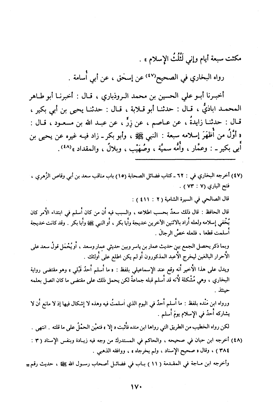«أَوَّلُ مَنْ أَظْهَرَ إِسْلَامَهُ سَبْعَةٌ: النَّبِيُّ صلى الله عليه وآله وَسَلَّمَ، وَأَبُو بَكْرٍ- زَادَ فِيهِ غَيْرُهُ عَنْ يَحْيَى بْنِ أَبِي بُكَيْرٍ-: وَعَمَّارٌ، وأمه سمية، وصهيب، وبلال، والمقداد» [ (48) ] .
