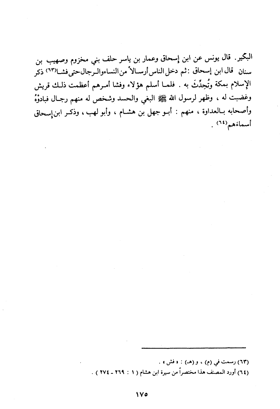 الْبُكَيْرِ. قَالَ يُونُسُ عَنِ ابْنِ إِسْحَاقَ وَعَمَّارُ بْنُ ياسر حلف بَنِي مَخْزُومٍ وَصُهَيْبُ بْنُ سِنَانٍ قَالَ ابْنُ إِسْحَاقَ: ثُمَّ دَخَلَ النَّاسُ أَرْسَالًا مِنَ النِّسَاءِ وَالرِّجَالِ حَتَّى فَشَا [ (63) ] ذِكْرُ الْإِسْلَامِ بِمَكَّةَ وَتُحُدِّثَ بِهِ. فَلَمَّا أَسْلَمَ هَؤُلَاءِ وَفَشَا أَمْرُهُمْ أَعْظَمَتْ ذَلِكَ قُرَيْشٌ وَغَضِبَتْ لَهُ، وَظَهَرَ لِرَسُولِ اللهِ صَلَّى اللهُ عليه وآله وَسَلَّمَ الْبَغْيُ وَالْحَسَدُ وَشَخَصَ لَهُ مِنْهُمْ رِجَالٌ فَبَادَوْهُ وَأَصْحَابَهُ بِالْعَدَاوَةِ، مِنْهُمْ: أَبُو جَهْلِ بْنُ هِشَامٍ، وَأَبُو لَهَبٍ» وَذَكَرَ ابْنُ إِسْحَاقَ أسماءهم [ (64) ] .