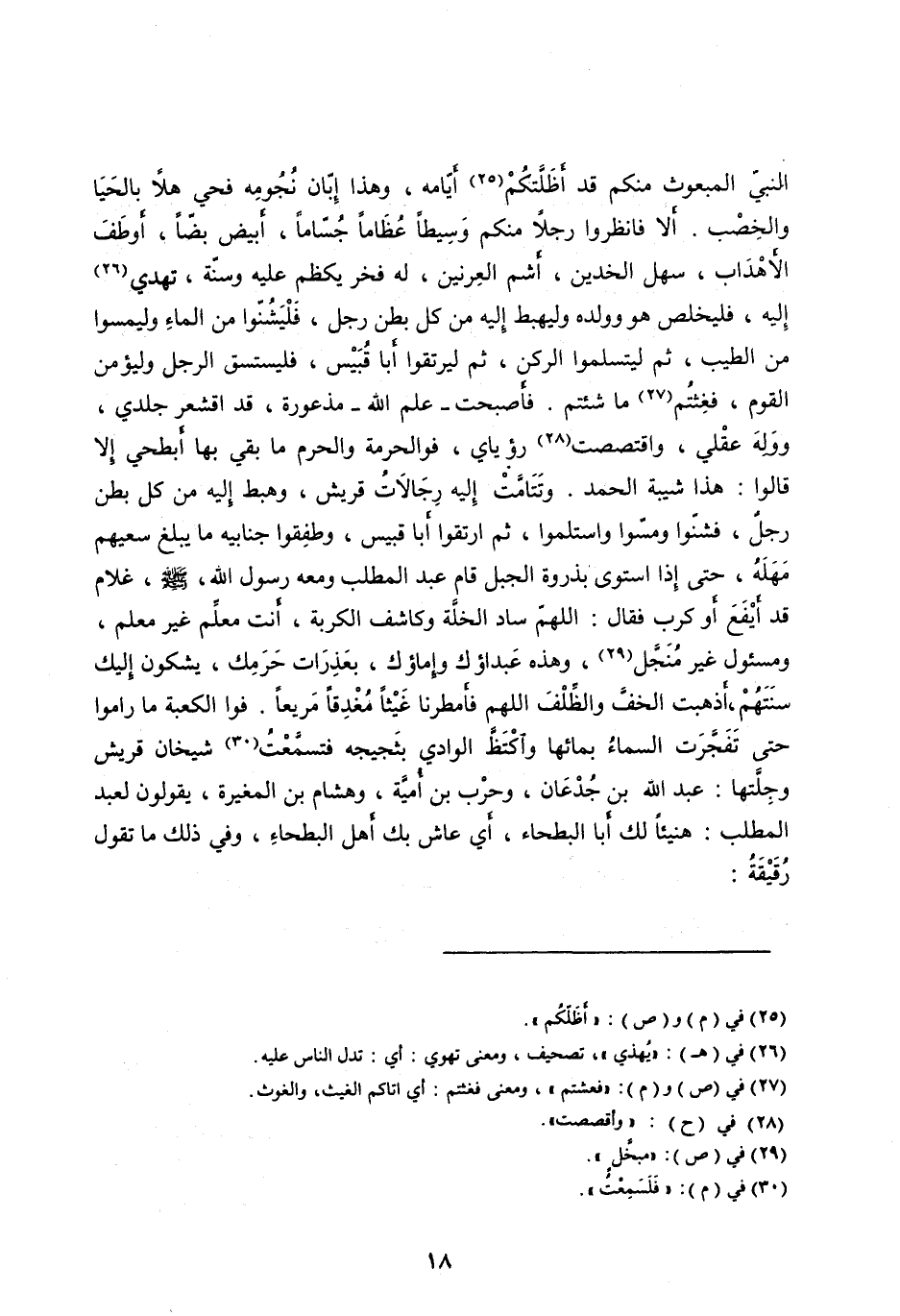 النَّبِيَّ الْمَبْعُوثَ مِنْكُمْ قَدْ أَظَلَّتْكُمْ [ (25) ] أَيَّامُهُ، وَهَذَا إِبَّانُ نُجُومِهِ فَحَيَّ هَلَا بِالْحَيَا وَالْخِصْبِ. أَلَا فَانْظُرُوا رَجُلًا مِنْكُمْ وَسِيطًا عُظَامًا جُسَامًا، أَبْيَضَ بَضًّا، أَوْطَفَ الْأَهْدَابِ، سَهْلَ الْخَدَّيْنِ، أَشَمَّ الْعِرْنِينِ، لَهُ فَخْرٌ يَكْظِمُ عَلَيْهِ وَسُنَّةٌ، تَهْدِي [ (26) ] إِلَيْهِ، فَلْيَخْلُصْ هُوَ وَوَلَدُهُ وَلْيَهْبِطْ إِلَيْهِ مِنْ كُلِّ بَطْنٍ رَجُلٌ، فَلْيَشُنُّوا مِنَ الْمَاءِ وَلْيَمَسُّوا مِنَ الطِّيبِ، ثُمَّ لِيَتَسَلَّمُوا الرُّكْنَ، ثُمَّ لِيَرْتَقُوا أَبَا قُبَيْسٍ، فَلْيَسْتَسْقِ الرَّجُلُ وَلْيُؤَمِّنِ الْقَوْمُ، فَغِثْتُمْ [ (27) ] مَا شِئْتُمْ. فَأَصْبَحْتُ- عَلِمَ اللهُ- مَذْعُورَةً، قَدِ اقْشَعَرَّ جِلْدِي، وَوَلِهَ عقلي، واقتصصت [ (28) ] رؤياي، فو الحرمة وَالْحَرَمِ مَا بَقِيَ بِهَا أَبْطَحِيٌّ إِلَّا قَالُوا: هَذَا شَيْبَةُ الْحَمْدِ. وَتَتَامَّتْ إِلَيْهِ رِجَالَاتُ قُرَيْشٍ، وَهَبَطَ إِلَيْهِ مِنْ كُلِّ بَطْنٍ رَجُلٌ، فَشَنُّوا وَمَسُّوا واسْتَلَمُوا، ثُمَّ ارْتَقَوْا أَبَا قُبَيْسٍ، وَطَفِقُوا جَنَابَيْهِ مَا يَبْلُغُ سَعْيُهُمْ مَهَلَهُ، حَتَّى إِذَا اسْتَوَى بِذِرْوَةِ الْجَبَلِ قَامَ عَبْدُ الْمُطَّلِبِ وَمَعَهُ رَسُولُ اللهِ، صلى الله عليه وآله وَسَلَّمَ، غُلَامٌ قَدْ أَيْفَعَ أَوْ كَرَبَ فَقَالَ: اللهُمَّ سَادَّ الْخَلَّةِ وَكَاشِفَ الْكُرْبَةِ، أَنْتَ مُعَلِّمٌ غَيْرُ مُعَلَّمٍ، وَمَسْئُولٌ غَيْرُ مُنَجَّلٍ [ (29) ] ، وَهَذِهِ عُبَدَاؤُكَ وَإِمَاؤُكَ، بِعَذِرَاتِ حَرَمِكَ، يَشْكُونَ إِلَيْكَ سَنَتَهُمْ، أَذْهَبَتِ الْخُفَّ وَالظِّلْفَ اللهُمَّ فَأَمْطِرْنَا غيثا مغدقا مريعا. فو الكعبة مَا رَامُوا حَتَّى تَفَجَّرَتِ السَّمَاءُ بِمَائِهَا وَاكْتَظَّ الْوَادِي بِثَجِيجِهِ فَتَسَمَّعَتْ [ (30) ] شِيخَانُ قُرَيْشٍ وَجِلَّتُهَا: عَبْدُ اللهِ بْنُ جُدْعَانَ، وَحَرْبُ بْنُ أُمَيَّةَ، وَهِشَامُ بْنُ الْمُغِيرَةِ، يَقُولُونَ لِعَبْدِ الْمُطَّلِبِ: هَنِيئًا لَكَ أَبَا الْبَطْحَاءِ، أَيْ عَاشَ بِكَ أَهْلُ الْبَطْحَاءِ، وَفِي ذَلِكَ مَا تَقُولُ رُقَيْقَةُ: