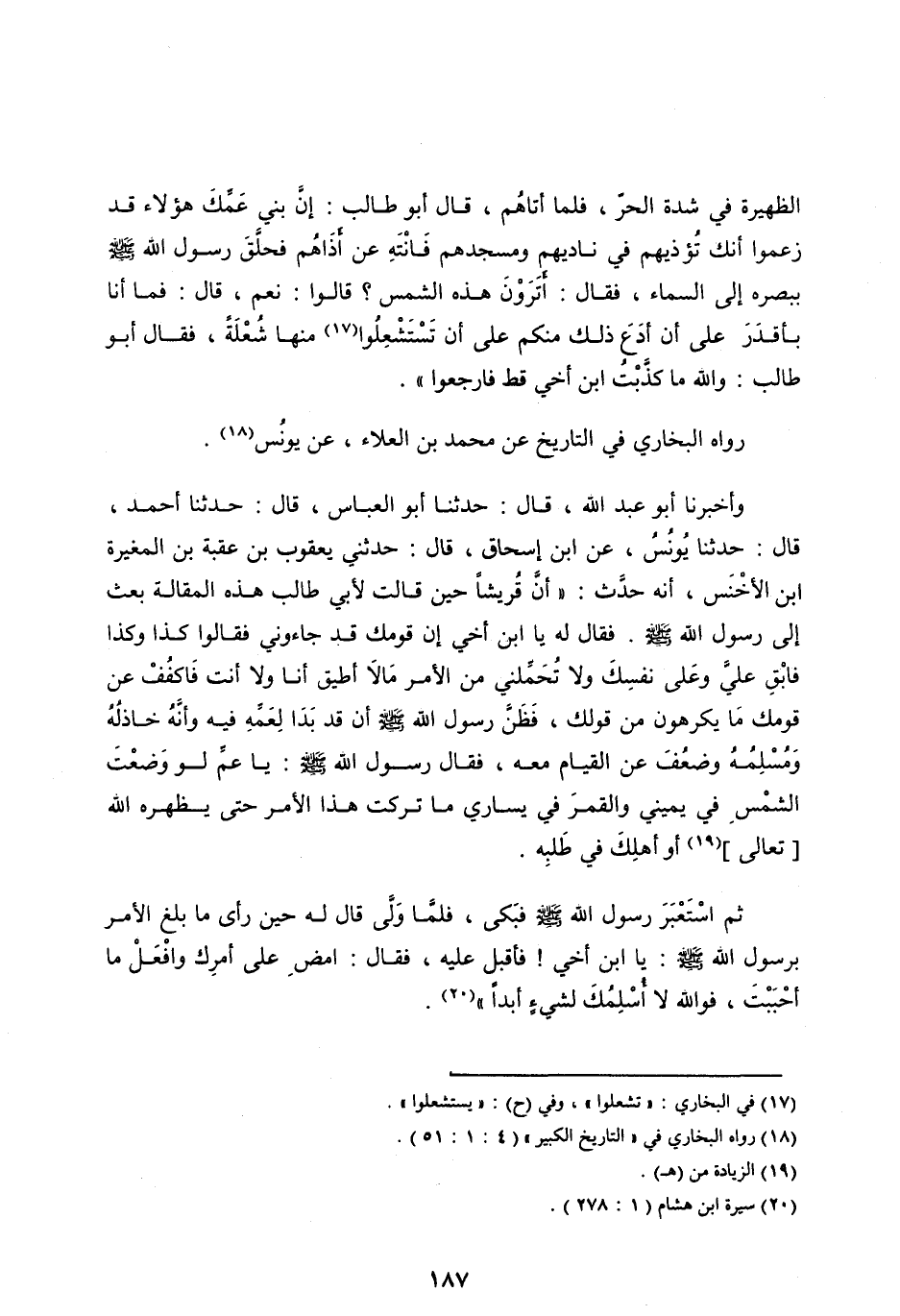 الظَّهِيرَةِ فِي شِدَّةِ الْحَرِّ، فَلَمَّا أَتَاهُمْ، قَالَ أَبُو طَالِبٍ: إِنَّ بَنِي عَمِّكَ هَؤُلَاءِ قَدْ زَعَمُوا أَنَّكَ تُؤْذِيهِمْ فِي نَادِيهِمْ وَمَسْجِدِهِمْ فَانْتَهِ عَنْ أَذَاهُمْ فَحَلَّقَ رَسُولُ اللهِ صَلَّى الله عليه وآله وَسَلَّمَ بِبَصَرِهِ إِلَى السَّمَاءِ، فَقَالَ: أَتَرَوْنَ هَذِهِ الشَّمْسَ؟ قَالُوا: نَعَمْ، قَالَ: فَمَا أَنَا بِأَقْدَرِ عَلَى أَنْ أَدَعَ ذَلِكَ مِنْكُمْ عَلَى أَنْ تَسْتَشْعِلُوا [ (17) ] مِنْهَا شُعْلَةً، فَقَالَ أَبُو طَالِبٍ: وَاللهِ مَا كَذَّبْتَ ابْنَ أَخِي قَطُّ فَارْجِعُوا» .