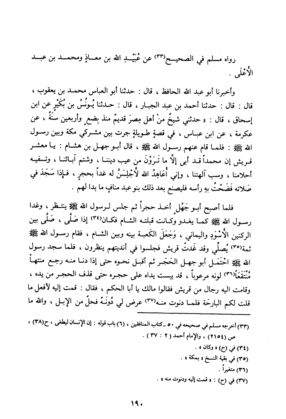 فَلَمَّا أَصْبَحَ أَبُو جَهْلٍ أَخَذَ حَجَرًا ثُمَّ جَلَسَ لِرَسُولِ اللهِ صَلَّى اللهُ عَلَيْهِ وآله وَسَلَّمَ يَنْتَظِرُ، وَغَدَا رَسُولُ الله صلى الله عليه وآله وَسَلَّمَ كَمَا يَغْدُو وَكَانَتْ قِبْلَتُهُ الشَّامَ فَكَانَ [ (34) ] إِذَا صَلَّى، صَلَّى بَيْنَ الرُّكْنَيْنِ الْأَسْوَدِ وَالْيَمَانِيِّ، وَجَعَلَ الْكَعْبَةَ بَيْنَهُ وَبَيْنَ الشَّامِ، فَقَامَ رَسُولُ اللهِ صَلَّى اللهُ عَلَيْهِ وآله وَسَلَّمَ ثَمَّةَ [ (35) ] يُصَلِّي وَقَدْ غَدَتْ قُرَيْشٌ فَجَلَسُوا فِي أَنْدِيَتِهِمْ يَنْظُرُونَ، فَلَمَّا سَجَدَ رسول الله صلى الله عليه وآله وَسَلَّمَ احْتَمَلَ أَبُو جَهْلٍ الْحَجَرَ ثُمَّ أَقْبَلَ نَحْوَهُ حَتَّى إِذَا دَنَا مِنْهُ رجع منتها مُنْتَقِعًا [ (36) ] لَوْنُهُ مُرْعُوبًا، قَدْ يَبُسَتْ يَدَاهُ عَلَى حَجَرِهِ حَتَّى قَذَفَ الْحَجَرَ مِنْ يَدِهِ، وَقَامَتْ إِلَيْهِ رِجَالٌ من قريش فقالوا مالك يَا أَبَا الْحَكَمِ، فَقَالَ: قُمْتُ إِلَيْهِ لِأَفْعَلَ مَا قُلْتُ لَكُمُ الْبَارِحَةَ فَلَمَّا دَنَوْتُ مِنْهُ [ (37) ] عَرَضَ لِي دُونَهُ فَحْلٌ مِنَ الْإِبِلِ، والله ما