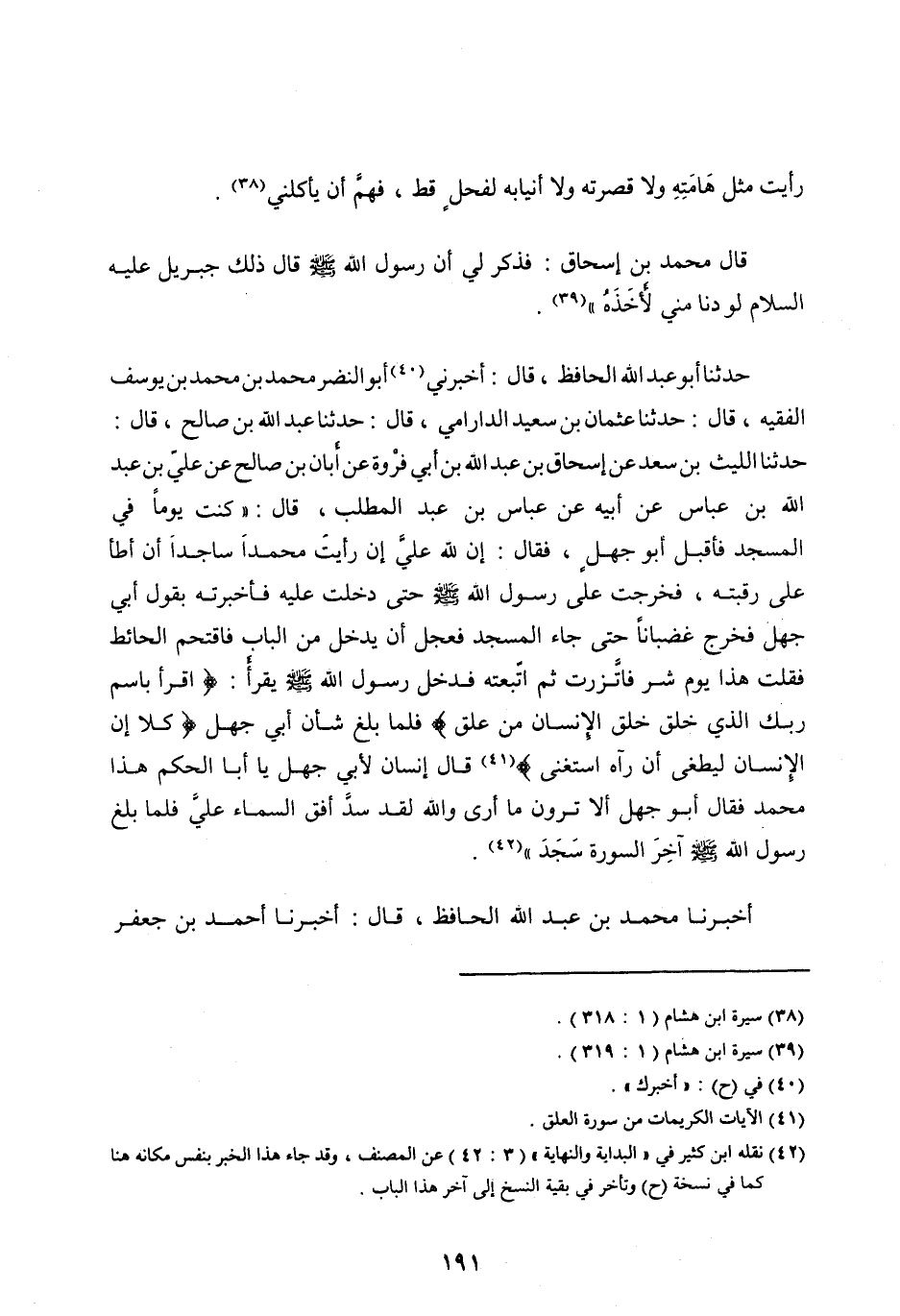 [ (42) ] نقله ابن كثير في «البداية والنهاية» (3: 42) عن المصنف، وقد جاء هذا الخبر بنفس مكانه هنا كما في نسخة (ح) وتأخر في بقية النسخ إلى آخر هذا الباب.