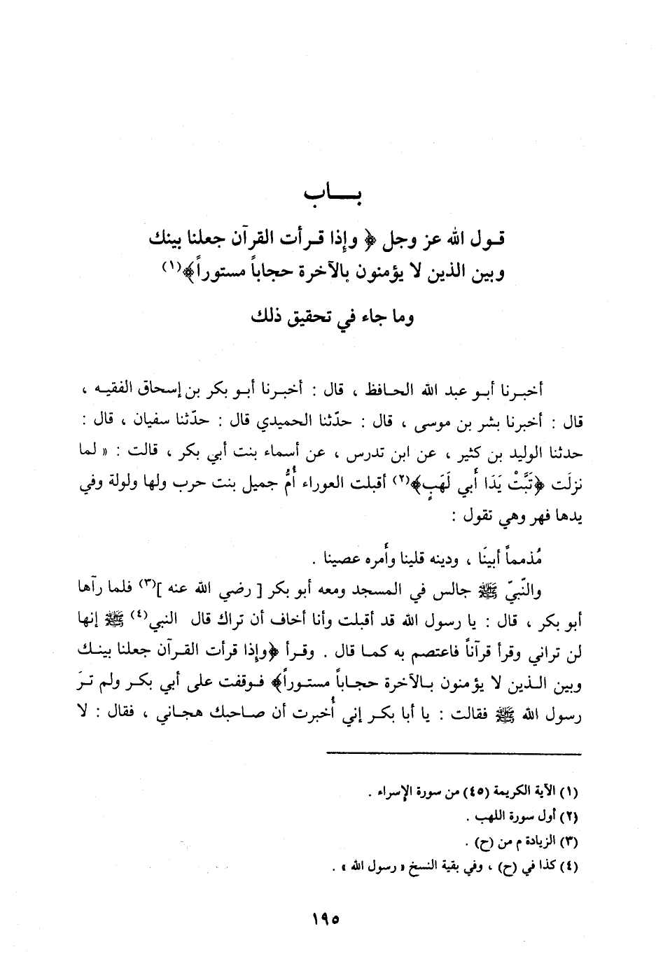 بَابُ قَوْلِ اللهِ عَزَّ وَجَلَّ وَإِذا قَرَأْتَ الْقُرْآنَ جَعَلْنا بَيْنَكَ وَبَيْنَ الَّذِينَ لَا يُؤْمِنُونَ بِالْآخِرَةِ حِجاباً مَسْتُوراً [ (1) ] وَمَا جَاءَ فِي تَحْقِيقِ ذَلِكَ
