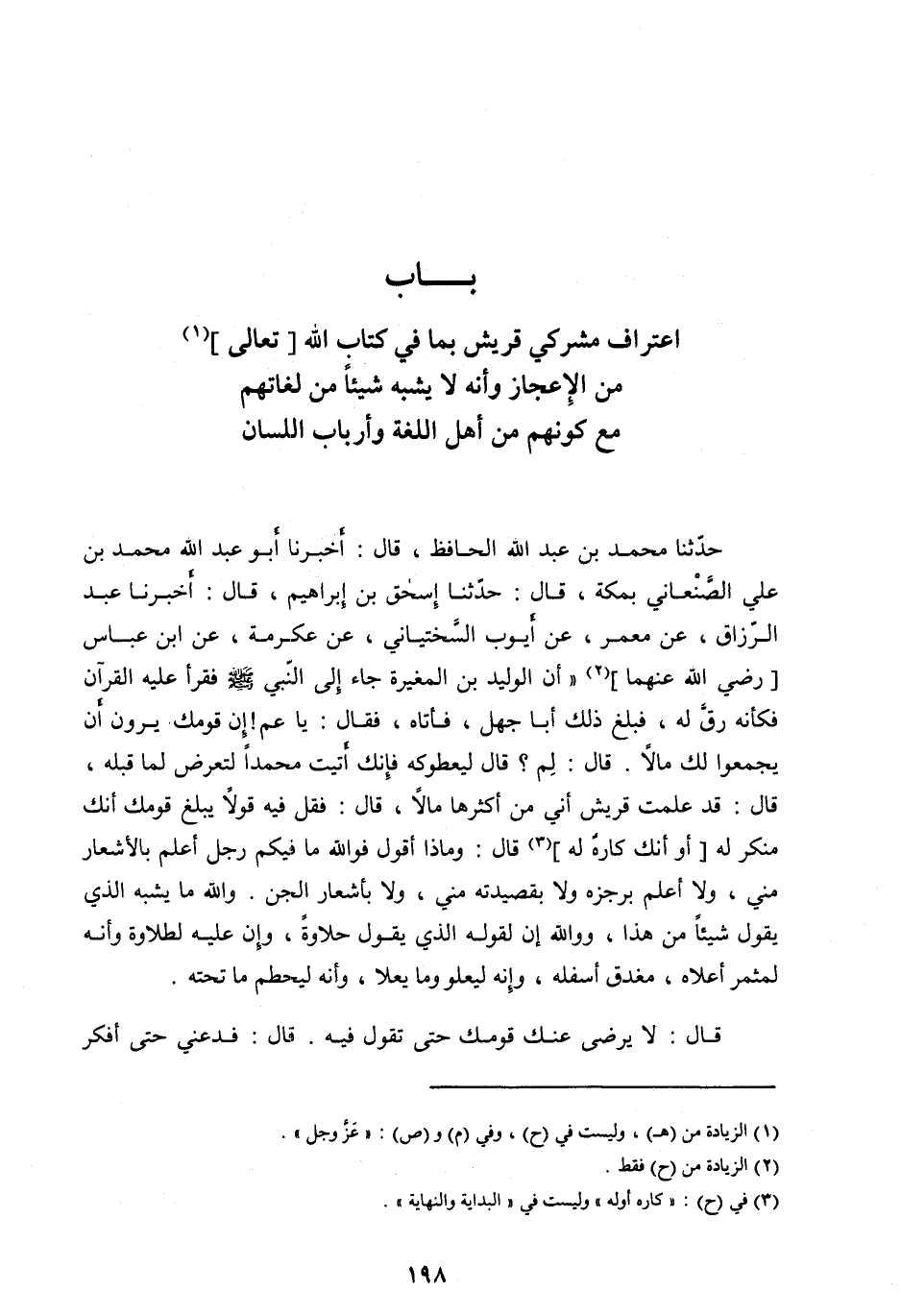 حَدَّثَنَا مُحَمَّدُ بْنُ عَبْدِ اللهِ الْحَافِظُ، قَالَ: أَخْبَرَنَا أَبُو عَبْدِ اللهِ مُحَمَّدُ بْنُ عَلِيٍّ الصَّنْعَانِيُّ بِمَكَّةَ، قال: حدّثنا إسحق بْنُ إِبْرَاهِيمَ، قَالَ: أَخْبَرَنَا عَبْدُ الرَّزَّاقِ، عَنْ مَعْمَرٍ، عَنْ أَيُّوبَ السَّخْتِيَانِيِّ، عَنْ عِكْرِمَةَ، عَنِ ابْنِ عَبَّاسٍ [رَضِيَ اللهُ عَنْهُمَا] [ (2) ] «أَنَّ الْوَلِيدَ بْنَ الْمُغِيرَةِ جَاءَ إِلَى النَّبِيِّ صَلَّى اللهُ عليه وآله وَسَلَّمَ فَقَرَأَ عَلَيْهِ الْقُرْآنَ فَكَأَنَّهُ رَقَّ لَهُ، فَبَلَغَ ذَلِكَ أَبَا جَهْلٍ، فَأَتَاهُ، فَقَالَ: يَا عَمِّ! إِنَّ قَوْمَكَ يَرَوْنَ أَنْ يَجْمَعُوا لَكَ مَالًا. قَالَ: لِمَ؟ قَالَ لِيُعْطُوكَهُ فَإِنَّكَ أَتَيْتَ مُحَمَّدًا لِتَعْرِضَ لِمَا قِبَلَهُ، قَالَ: قَدْ عَلِمَتْ قُرَيْشٌ أَنِّي مِنْ أَكْثَرِهَا مَالًا، قَالَ: فَقُلْ فِيهِ قَوْلًا يَبْلُغُ قَوْمَكَ أَنَّكَ مُنْكِرٌ لَهُ [أَوْ أَنَّكَ كَارِهٌ لَهُ] [ (3) ] قَالَ: وَمَاذَا أَقُولُ فو الله مَا فِيكُمْ رَجُلٌ أَعْلَمَ بِالْأَشْعَارِ مِنِّي، وَلَا أَعْلَمَ بِرَجَزِهِ وَلَا بِقَصِيدَتِهِ مِنِّي، وَلَا بِأَشْعَارِ الْجِنِّ. وَاللهِ مَا يُشْبِهُ الَّذِي يَقُولُ شَيْئًا مِنْ هَذَا، وو الله إِنَّ لِقَوْلِهِ الَّذِي يَقُولُ حَلَاوَةً، وَإِنَّ عَلَيْهِ لَطَلَاوَةً وَإِنَّهُ لَمُثْمِرٌ أَعْلَاهُ، مُغْدِقٌ أَسْفَلُهُ، وَإِنَّهُ لَيَعْلُو وَمَا يُعْلَا، وَأَنَّهُ لَيَحْطِمُ مَا تَحْتَهُ.