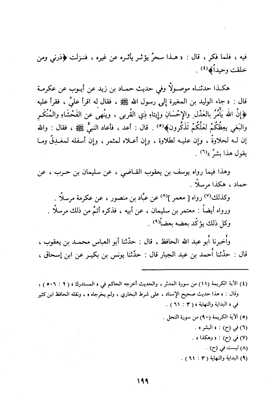 وَفِي حَدِيثِ حَمَّادِ بْنِ زَيْدٍ عَنْ أَيُّوبَ عَنْ عِكْرِمَةَ قَالَ: «جَاءَ الْوَلِيدُ بْنُ الْمُغِيرَةِ إِلَى رَسُولِ اللهِ صلى الله عليه وآله وَسَلَّمَ، فَقَالَ لَهُ اقْرَأْ عَلَيَّ، فَقَرَأَ عَلَيْهِ إِنَّ اللَّهَ يَأْمُرُ بِالْعَدْلِ وَالْإِحْسانِ وَإِيتاءِ ذِي الْقُرْبى، وَيَنْهى عَنِ الْفَحْشاءِ وَالْمُنْكَرِ وَالْبَغْيِ يَعِظُكُمْ لَعَلَّكُمْ تَذَكَّرُونَ [ (5) ] . قَالَ: أَعِدْ، فَأَعَادَ النَّبِيُّ صَلَّى اللهُ عَلَيْهِ وآله وَسَلَّمَ، فَقَالَ: وَاللهِ إِنَّ لَهُ لَحَلَاوَةً، وَإِنَّ عَلَيْهِ لَطَلَاوَةً، وَإِنَّ أَعْلَاهُ لَمُثْمِرٌ، وَإِنَّ أَسْفَلُهُ لَمُغْدِقٌ وَمَا يَقُولُ هَذَا بَشَرٌ» [ (6) ] .