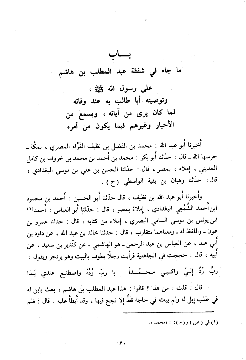 بَابُ مَا جَاءَ فِي شَفَقَةِ عَبْدِ الْمُطَّلِبِ بْنِ هَاشِمٍ عَلَى رَسُولِ اللهِ صَلَّى اللهُ عليه وآله وَسَلَّمَ، وَتَوْصِيَتِهِ أَبَا طَالِبٍ بِهِ عِنْدَ وَفَاتِهِ لِمَا كَانَ يَرَى مِنْ آيَاتِهِ، وَيَسْمَعُ مِنَ الْأَحْبَارِ وَغَيْرِهِمْ فِيمَا يَكُونُ مِنْ أَمْرِهِ