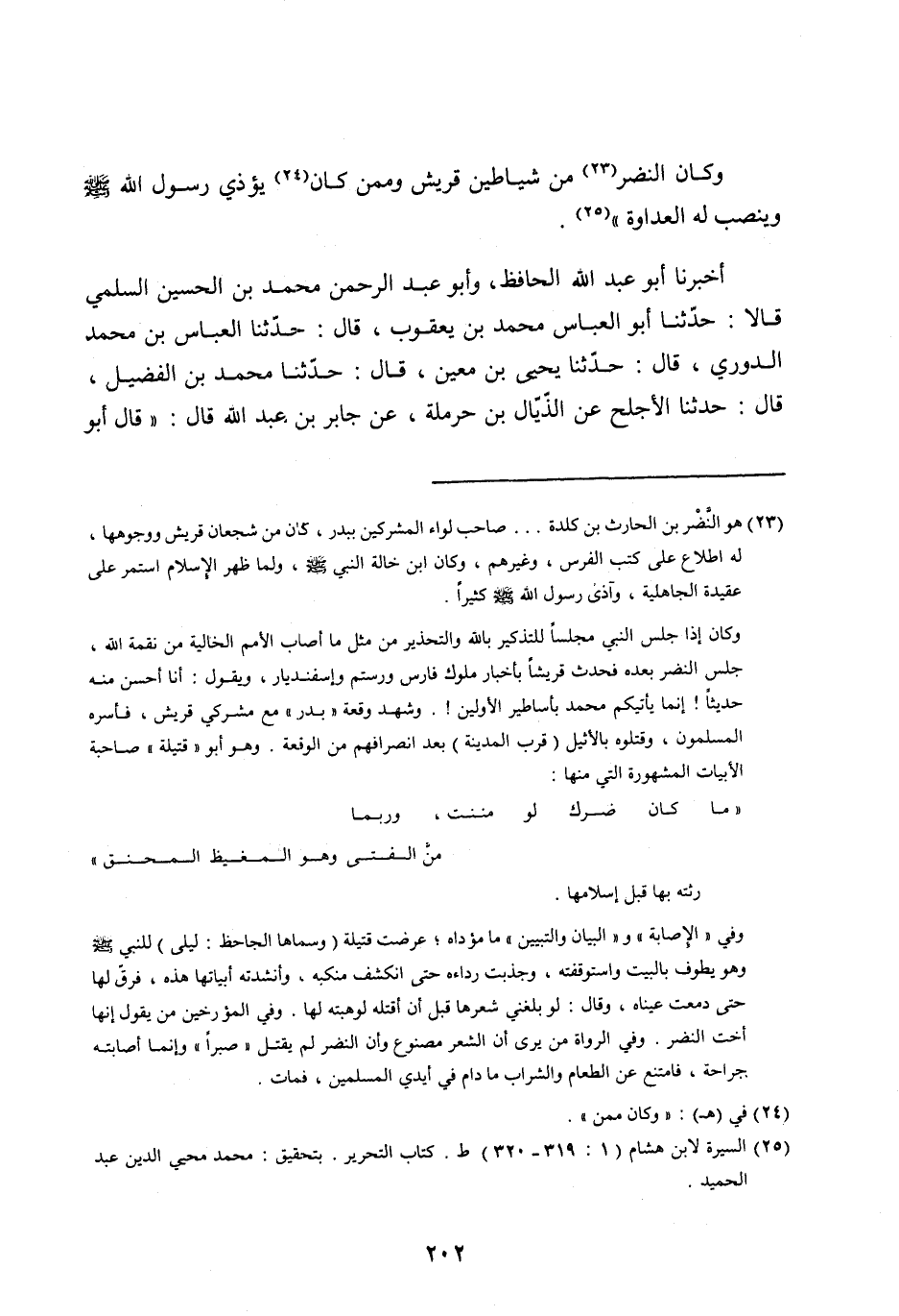 وَكَانَ النَّضْرُ [ (23) ] مِنْ شَيَاطِينِ قُرَيْشٍ وَمِمَّنْ كَانَ [ (24) ] يُؤْذِي رَسُولَ اللهِ صَلَّى اللهُ عَلَيْهِ وآله وَسَلَّمَ وَيَنْصِبُ لَهُ الْعَدَاوَةَ» [ (25) ] .