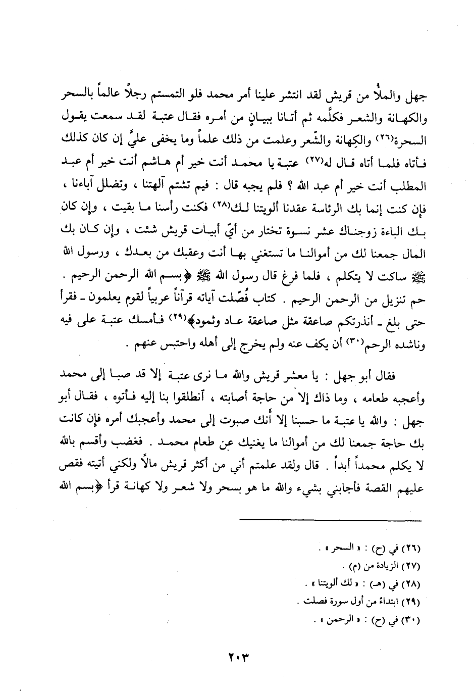 جَهْلٍ وَالْمَلَأُ مِنْ قُرَيْشٍ لَقَدِ انْتَشَرَ عَلَيْنَا أَمْرُ مُحَمَّدٍ فَلَوِ الْتَمَسْتُمْ رَجُلًا عَالِمًا بِالسِّحْرِ وَالْكِهَانَةِ وَالشِّعْرِ فَكَلَّمَهُ ثُمَّ أَتَانَا بِبَيَانٍ مِنْ أَمْرِهِ فَقَالَ عُتْبَةُ لقد سمعت يقول السَّحَرَةِ [ (26) ] وَالْكِهَانَةِ وَالشِّعْرِ وَعَلِمْتُ مِنْ ذَلِكَ عِلْمًا وَمَا يَخْفَى عَلَيَّ إِنْ كَانَ كَذَلِكَ فَأَتَاهُ فَلَمَّا أَتَاهُ قَالَ لَهُ [ (27) ] عُتْبَةُ يَا مُحَمَّدُ أَنْتَ خَيْرٌ أَمْ هَاشِمٌ أَنْتَ خَيْرٌ أَمْ عَبْدُ الْمُطَّلِبِ أَنْتَ خَيْرُ أَمْ عَبْدُ اللهِ؟ فَلَمْ يُجِبْهُ قَالَ: فِيمَ تَشْتُمُ آلِهَتَنَا، وَتُضَلِّلُ آبَاءَنَا، فَإِنْ كُنْتَ إِنَّمَا بِكَ الرِّئَاسَةُ عَقَدْنَا أَلْوِيَتَنَا لَكَ [ (28) ] فَكُنْتَ رَأْسَنَا مَا بَقِيتَ، وَإِنْ كَانَ بِكَ الْبَاءَةُ زَوَّجْنَاكَ عَشْرَ نِسْوَةٍ تَخْتَارُ مِنْ أَيِّ أَبْيَاتِ قُرَيْشٍ شِئْتَ، وَإِنْ كَانَ بِكَ الْمَالُ جَمَعْنَا لَكَ مِنْ أَمْوَالِنَا مَا تَسْتَغْنِي بِهَا أَنْتَ وَعَقِبُكَ مِنْ بَعْدِكَ، وَرَسُولُ الله صلى الله عليه وآله وَسَلَّمَ سَاكِتٌ لَا يَتَكَلَّمُ، فَلَمَّا فَرَغَ قَالَ رَسُولُ اللهِ صَلَّى الله عليه وآله وَسَلَّمَ بِسْمِ اللَّهِ الرَّحْمنِ الرَّحِيمِ.