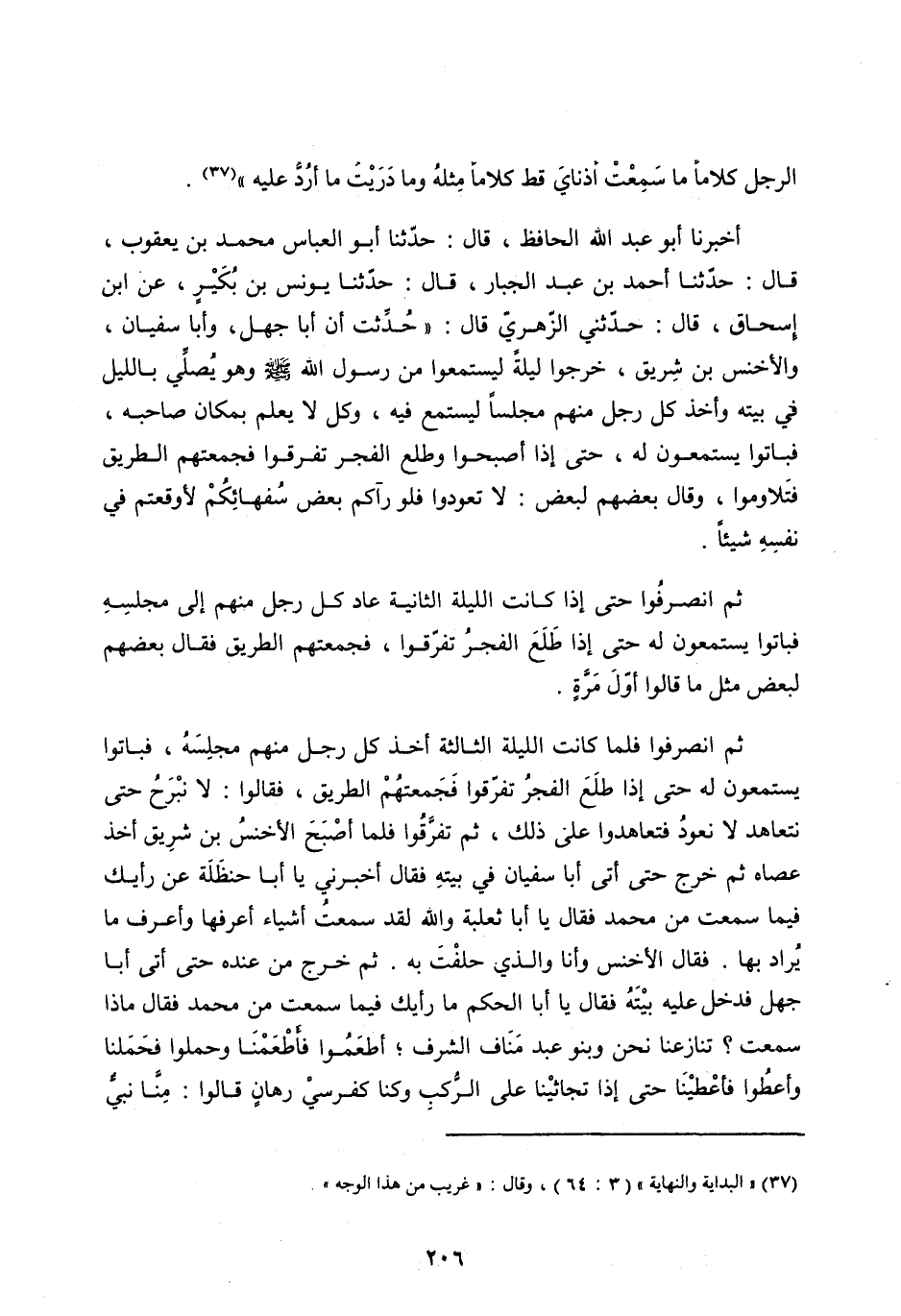 ثُمَّ انْصَرَفُوا فَلَمَّا كَانَتِ اللَّيْلَةُ الثَّالِثَةُ أَخَذَ كُلُّ رَجُلٍ مِنْهُمْ مَجْلِسَهُ، فَبَاتُوا يَسْتَمِعُونَ لَهُ حَتَّى إِذَا طَلَعَ الْفَجْرُ تَفَرَّقُوا فَجَمَعَتْهُمُ الطَّرِيقُ، فَقَالُوا: لَا نَبْرَحُ حَتَّى نَتَعَاهَدَ لَا نَعُودُ فَتَعَاهَدُوا عَلَى ذَلِكَ، ثُمَّ تَفَرَّقُوا فَلَمَّا أَصْبَحَ الْأَخْنَسُ بْنُ شَرِيقٍ أَخَذَ عَصَاهُ ثُمَّ خَرَجَ حَتَّى أَتَى أَبَا سُفْيَانَ فِي بَيْتِهِ فَقَالَ أَخْبِرْنِي يَا أَبَا حَنْظَلَةَ عَنْ رَأْيِكَ فِيمَا سَمِعْتَ مِنْ مُحَمَّدٍ فَقَالَ يَا أَبَا ثَعْلَبَةَ وَاللهِ لَقَدْ سَمِعْتُ أَشْيَاءَ أَعْرِفُهَا وَأَعْرِفُ مَا يُرَادُ بِهَا. فَقَالَ الْأَخْنَسُ وَأَنَا وَالَّذِي حَلَفْتُ بِهِ. ثُمَّ خَرَجَ مِنْ عِنْدِهِ حَتَّى أَتَى أَبَا جَهْلٍ فَدَخَلَ عَلَيْهِ بَيْتَهُ فَقَالَ يَا أَبَا الْحَكَمِ مَا رَأْيُكَ فِيمَا سَمِعْتَ من مُحَمَّدٍ فَقَالَ مَاذَا سَمِعْتَ؟ تَنَازَعْنَا نَحْنُ وَبَنُو عَبْدِ مَنَافٍ الشَّرَفَ، أَطْعَمُوا فَأَطْعَمْنَا وَحَمَلُوا فَحَمَلْنَا وَأَعْطَوْا فَأَعْطَيْنَا حَتَّى إِذَا تَجَاثَيْنَا عَلَى الرُّكَبِ وَكُنَّا كَفَرَسَيْ رِهَانٍ قالوا: منّا نبيّ