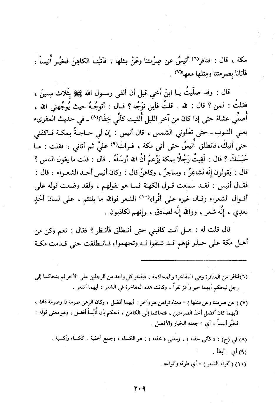 مَكَّةَ، قَالَ: فَنَافَرَ [ (6) ] أُنَيْسٌ عَنْ صِرْمَتِنَا وَعَنْ مِثْلِهَا، فَأَتَيْنَا الْكَاهِنَ فَخَيَّرَ أُنَيْسًا، فَأَتَانَا بِصِرْمَتِنَا وَمِثْلِهَا مَعَهَا [ (7) ] .