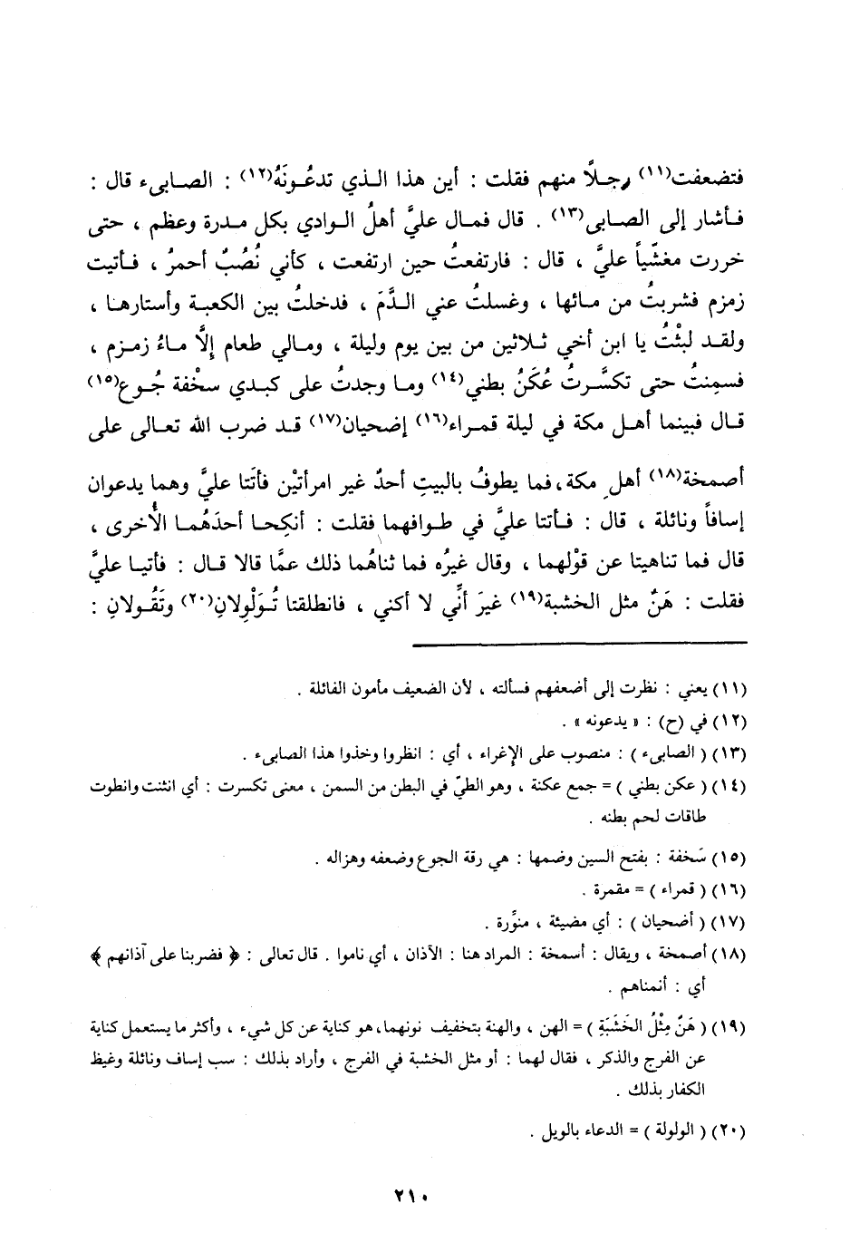 فَأَشَارَ إِلَى الصابي [ (13) ] . قَالَ فَمَالَ عَلَيَّ أَهْلُ الْوَادِي بِكُلِّ مَدَرَةٍ وَعَظْمٍ، حَتَّى خَرَرْتُ مَغْشِيًّا عَلَيَّ، قَالَ: فَارْتَفَعْتُ حِينَ ارْتَفَعَتُ، كَأَنِّي نُصُبٌ أَحْمَرُ، فَأَتَيْتُ زَمْزَمَ فَشَرِبْتُ مِنْ مَائِهَا، وَغَسَلَتُ عَنِّي الدَّمَ، فَدَخَلْتُ بَيْنَ الْكَعْبَةِ وَأَسْتَارِهَا، وَلَقَدْ لَبِثْتُ يَا ابْنَ أَخِي ثَلَاثِينَ مِنْ بَيْنِ يَوْمٍ وَلَيْلَةٍ، وَمَالِي طَعَامٌ إِلَّا ماء زمزم، فسمنت حتى تَكَسَّرَتْ عُكَنُ بَطْنِي [ (14) ] وَمَا وَجَدْتُ عَلَى كَبِدِي سُخْفَةَ جُوعٍ [ (15) ] قَالَ فَبَيْنَمَا أَهْلُ مَكَّةَ فِي لَيْلَةٍ قَمْرَاءَ [ (16) ] إِضْحِيَانٍ [ (17) ] قَدْ ضَرَبَ اللهُ تَعَالَى عَلَى أَصْمِخَةِ [ (18) ] أَهْلِ مَكَّةَ، فَمَا يَطُوفُ بِالْبَيْتِ أَحَدٌ غَيْرُ امْرَأَتَيْنِ فَأَتَتَا عَلَيَّ وَهُمَا يَدْعُوَانِ إِسَافًا ونَائِلَةَ، قَالَ: فَأَتَتَا عَلَيَّ فِي طَوَافِهِمَا فَقُلْتُ: أَنْكِحَا أَحَدَهُمَا الْأُخْرَى، قَالَ فَمَا تَنَاهَيَتَا عَنْ قَوْلِهِمَا، وَقَالَ غَيْرُهُ فَمَا ثَنَاهُمَا ذَلِكَ عَمَّا قَالَا قَالَ: فَأَتَيَا عَلَيَّ فَقُلْتُ: هَنٌ مِثْلُ الْخَشَبَةِ [ (19) ] غَيْرَ أَنِّي لَا أُكَنِّي، فَانْطَلَقَتَا تُوَلْوِلَانِ [ (20) ] وَتَقُولَانِ: