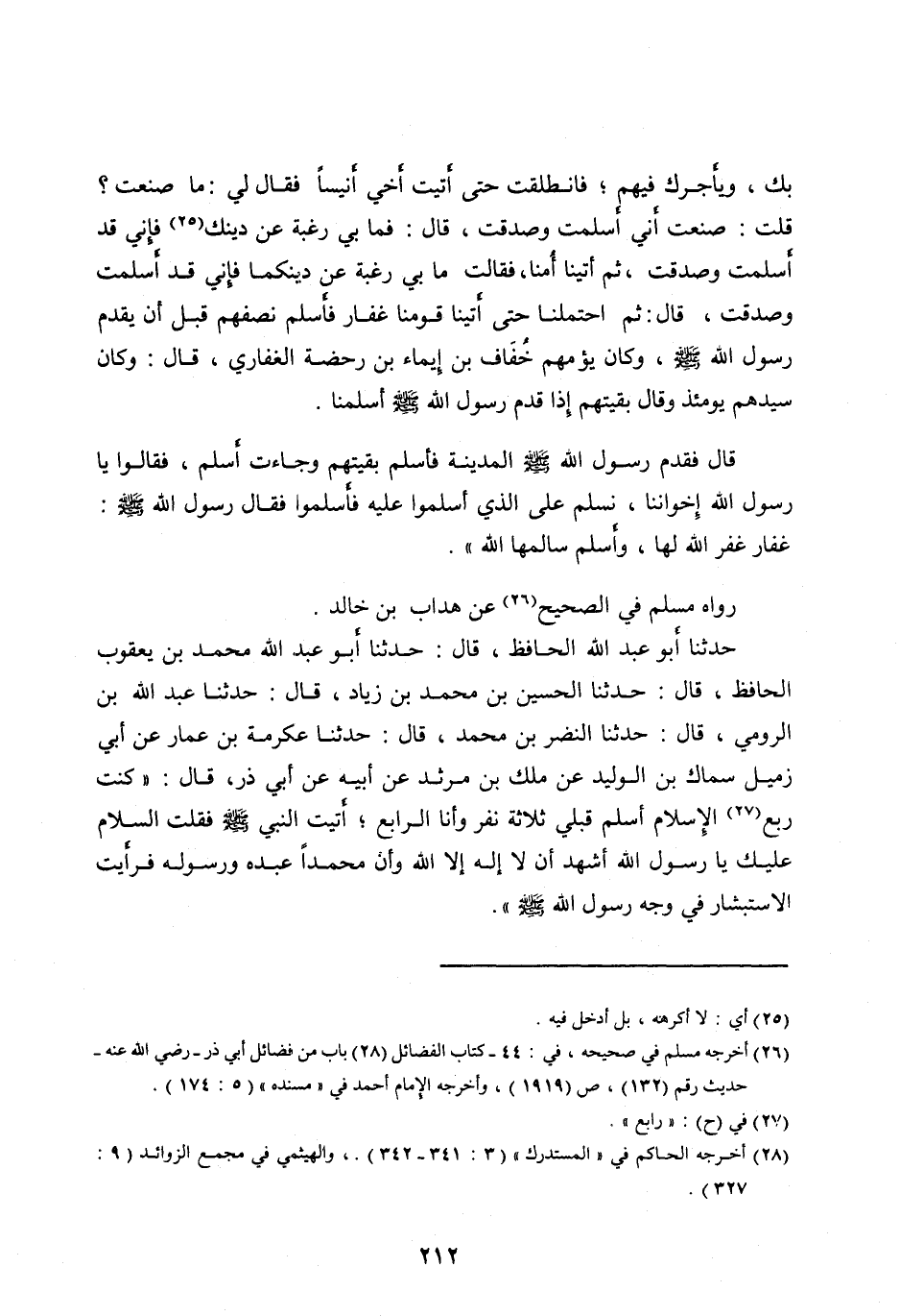 قُلْتُ: صَنَعْتُ أَنِّي أَسْلَمْتُ وَصَدَّقْتُ، قَالَ: فَمَا بِي رَغْبَةٌ عَنْ دِينِكِ [ (25) ] فَإِنِّي قَدْ أَسْلَمْتُ وَصَدَّقْتُ، ثُمَّ أَتَيْنَا أُمَّنَا، فَقَالَتْ مَا بِي رَغْبَةٌ عَنْ دِينِكُمَا فَإِنِّي قَدْ أَسْلَمْتُ وَصَدَّقْتُ، قَالَ: ثُمَّ احْتَمَلْنَا حَتَّى أتينا قومنا غفار فَأَسْلَمَ نِصْفُهُمْ قَبْلَ أَنْ يَقْدَمَ رَسُولُ اللهِ صلى الله عليه وآله وَسَلَّمَ، وَكَانَ يَؤُمُّهُمْ خُفَافُ بْنُ إِيمَاءِ بْنِ رَحَضَةَ الْغِفَارِيُّ، قَالَ: وَكَانَ سَيِّدَهُمْ يَوْمَئِذٍ وَقَالَ بَقِيَّتُهُمْ إِذَا قَدِمَ رَسُولُ اللهِ صَلَّى اللهُ عليه وآله وَسَلَّمَ أَسْلَمْنَا.