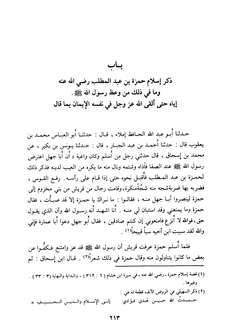 [ (1) ] قصة إسلام حَمْزَةَ- رَضِيَ اللهُ عَنْهُ- فِي سيرة ابن هشام (1: 312) ، والبداية والنهاية (3: 33) .