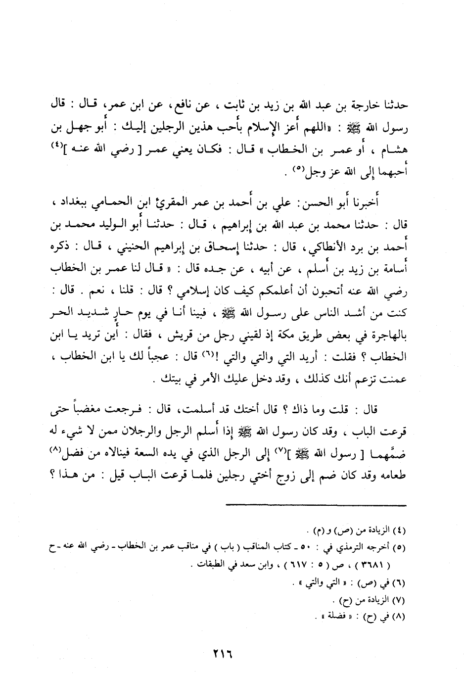 [ (5) ] أخرجه الترمذي في: 50- كتاب المناقب (باب) في مناقب عمر بن الخطاب- رضي الله عنه- ح (3681) ، ص (5: 617) ، وابن سعد في الطبقات.