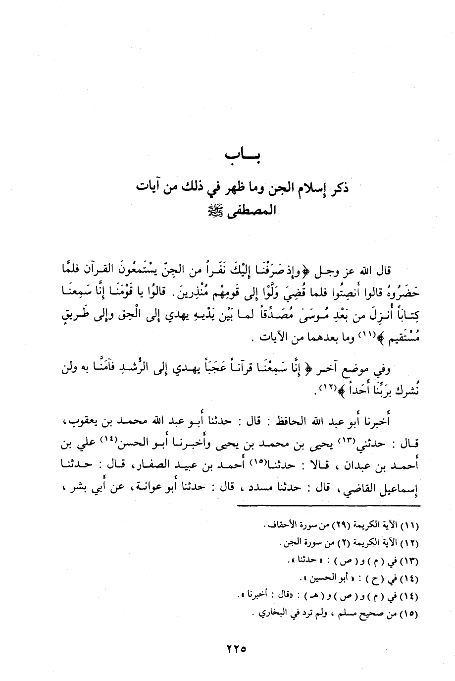 قَالَ اللهُ عَزَّ وَجَلَّ وَإِذْ صَرَفْنا إِلَيْكَ نَفَراً مِنَ الْجِنِّ يَسْتَمِعُونَ الْقُرْآنَ فَلَمَّا حَضَرُوهُ قالُوا أَنْصِتُوا فَلَمَّا قُضِيَ وَلَّوْا إِلى قَوْمِهِمْ مُنْذِرِينَ. قالُوا يَا قَوْمَنا إِنَّا سَمِعْنا كِتاباً أُنْزِلَ مِنْ بَعْدِ مُوسى مُصَدِّقاً لِما بَيْنَ يَدَيْهِ يَهْدِي إِلَى الْحَقِّ وَإِلى طَرِيقٍ مُسْتَقِيمٍ [ (11) ] وَمَا بَعْدَهُمَا مِنَ الْآيَاتِ.