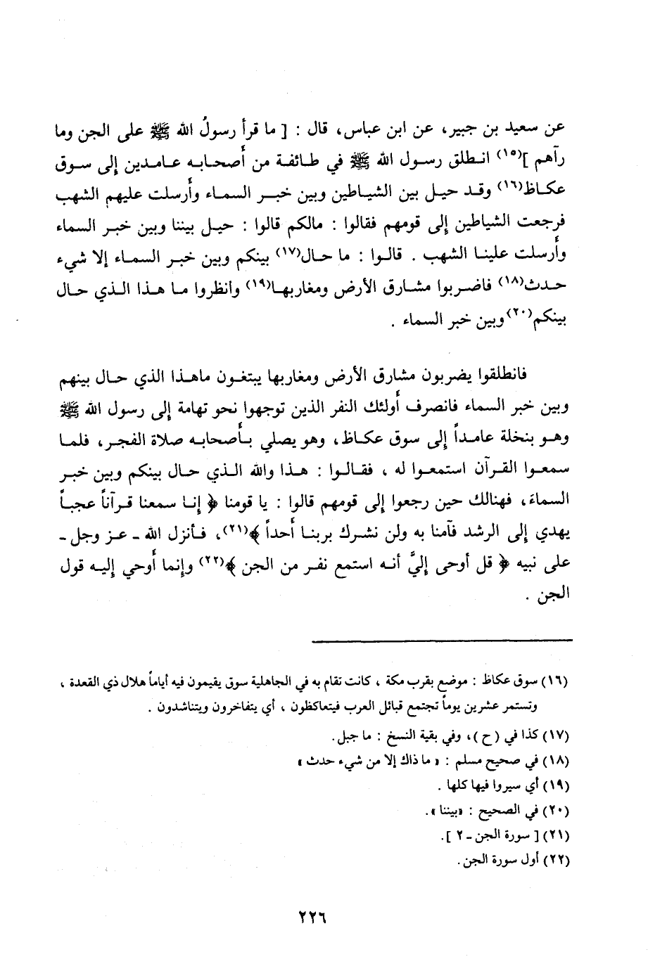 عَنْ سَعِيدِ بْنِ جُبَيْرٍ، عَنِ ابْنِ عَبَّاسٍ، قَالَ: [مَا قَرَأَ رَسُولُ اللهِ صَلَّى اللهُ عليه وآله وَسَلَّمَ عَلَى الْجِنِّ وَمَا رآهم] [ (15) ] انطلق رسول الله صلى الله عليه وآله وَسَلَّمَ فِي طَائِفَةٍ مِنْ أَصْحَابِهِ عَامِدِينَ إِلَى سُوقِ عُكَاظَ [ (16) ] وَقَدْ حِيلَ بَيْنَ الشَّيَاطِينِ وَبَيْنَ خَبَرِ السَّمَاءِ وَأُرْسِلَتْ عَلَيْهِمُ الشُّهُبُ فَرَجَعَتِ الشَّيَاطِينُ إِلَى قَوْمِهِمْ فَقَالُوا: مَا لَكُمْ قَالُوا: حِيلَ بَيْنَنَا وَبَيْنَ خَبَرِ السَّمَاءِ وَأُرْسِلَتْ عَلَيْنَا الشُّهُبُ. قَالُوا: مَا حَالَ [ (17) ] بَيْنَكُمْ وَبَيْنَ خَبَرِ السَّمَاءِ إِلَّا شَيْءٌ حَدَثَ [ (18) ] فَاضْرِبُوا مَشَارِقَ الْأَرْضِ وَمَغَارِبَهَا [ (19) ] وَانْظُرُوا مَا هَذَا الَّذِي حَالَ بَيْنَكُمْ [ (20) ] وَبَيْنَ خَبَرِ السَّمَاءِ.