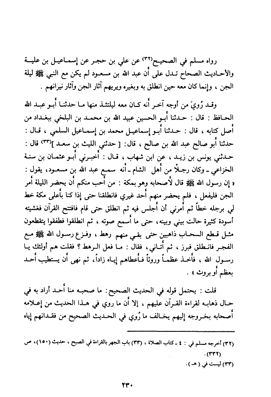 رَوَاهُ مُسْلِمٌ فِي الصَّحِيحِ [ (32) ] عَنْ عَلِيِّ بْنِ حُجْرٍ عن إسماعيل بن عُلَيَّةَ وَالْأَحَادِيثُ الصِّحَاحُ تَدُلُّ عَلَى أَنَّ عَبْدَ اللهِ بْنَ مَسْعُودٍ لَمْ يَكُنْ مَعَ النَّبِيِّ صَلَّى اللهُ عليه وآله وَسَلَّمَ لَيْلَةَ الْجِنِّ، وَإِنَّمَا كَانَ مَعَهُ حِينَ انْطَلَقَ بِهِ وَبِغَيرِهِ وَيُرِيَهُمْ آثَارَ الْجِنِّ وَآثَارَ نِيرَانِهِمْ.