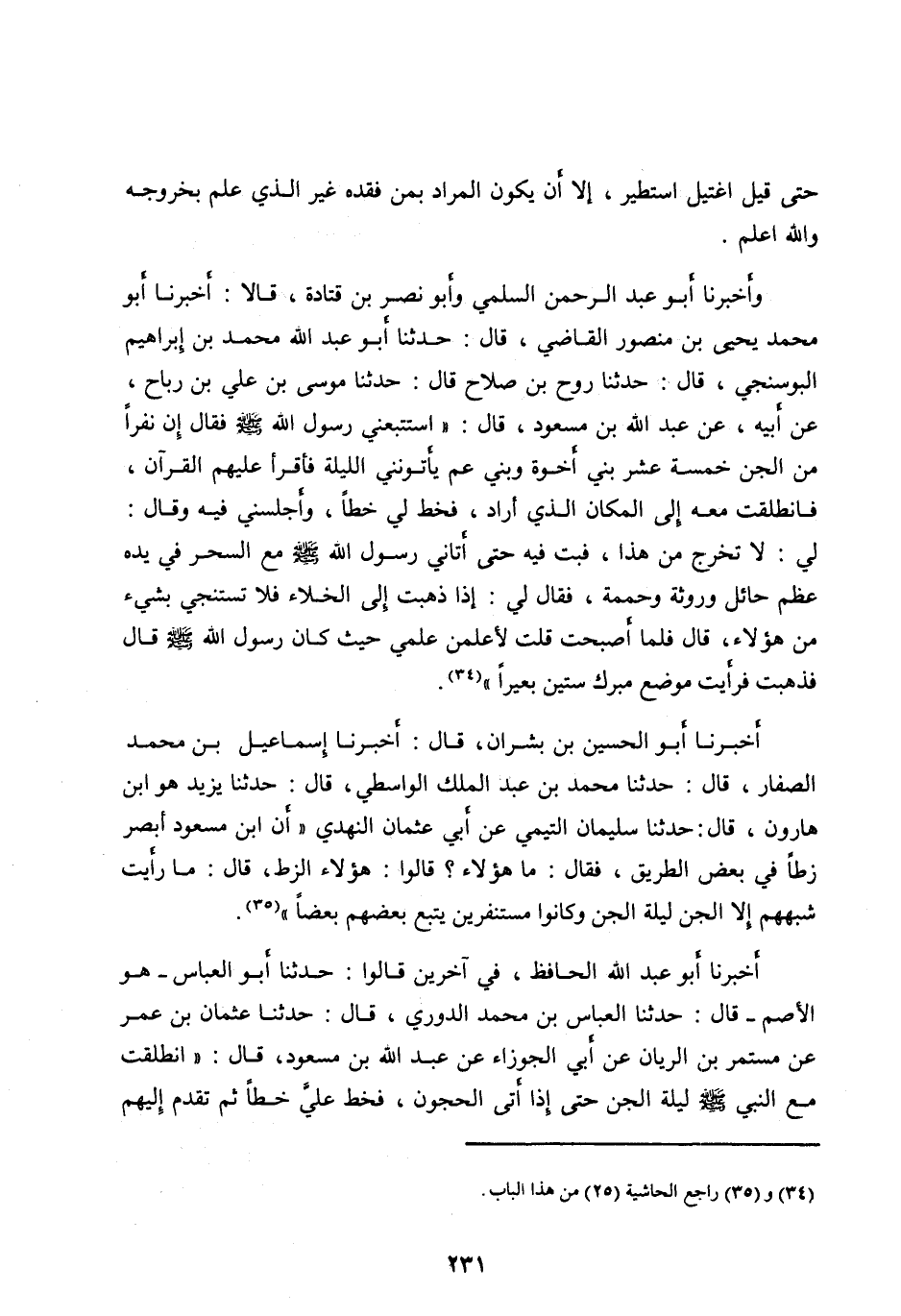 أَخْبَرَنَا أَبُو عَبْدِ اللهِ الْحَافِظُ، فِي آخَرِينَ قَالُوا: حَدَّثَنَا أَبُو الْعَبَّاسِ- هُوَ الْأَصَمُّ- قَالَ: حَدَّثَنَا الْعَبَّاسُ بْنُ مُحَمَّدٍ الدُّورِيُّ، قَالَ: حَدَّثَنَا عُثْمَانُ بْنُ عُمَرَ عَنْ مُسْتَمِرِّ بْنِ الرَّيَّانِ عَنْ أَبِي الْجَوْزَاءِ عَنْ عَبْدِ اللهِ بْنِ مَسْعُودٍ، قَالَ: «انْطَلَقْتُ مَعَ النَّبِيِّ صَلَّى اللهُ عليه وآله وَسَلَّمَ لَيْلَةَ الْجِنِّ حَتَّى إِذَا أَتَى الْحَجُونَ، فَخَطَّ عَلَيَّ خَطًّا ثُمَّ تَقَدَّمَ إليهم