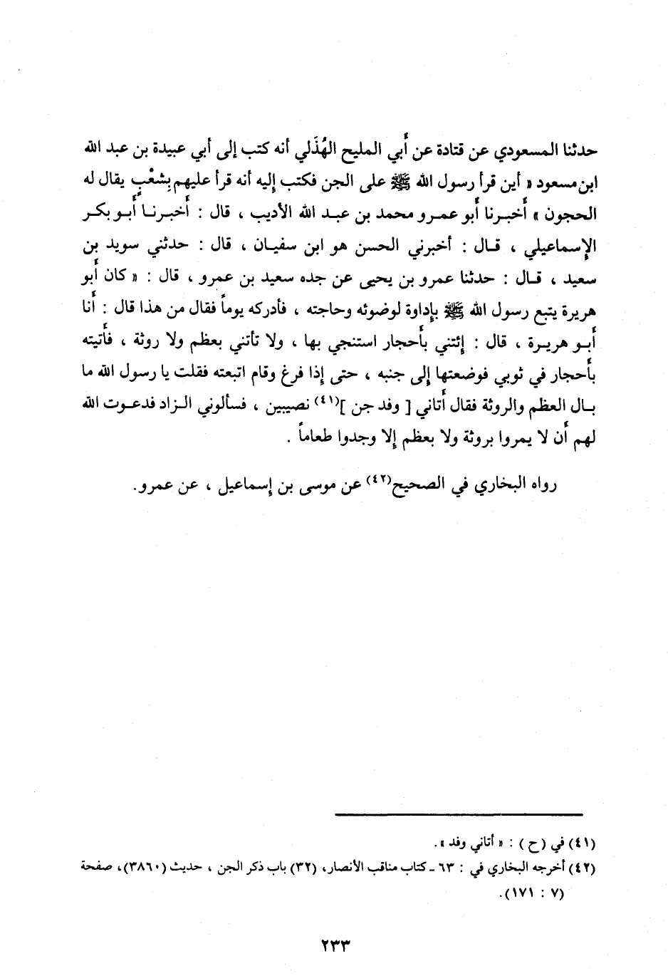 [ (42) ] أخرجه البخاري في: 63- كتاب مناقب الأنصار، (32) باب ذكر الجن، حديث (3860) ، صفحة (7: 171) .