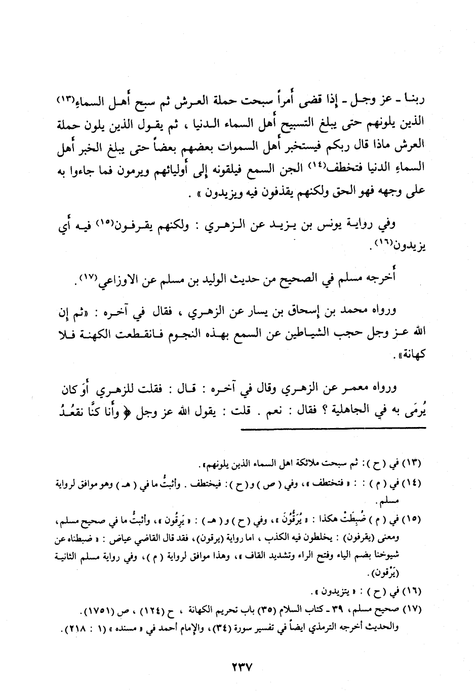 رَبُّنَا- عَزَّ وَجَلَّ- إِذَا قَضَى أَمْرًا سَبَّحَتْ حَمَلَةُ الْعَرْشِ ثُمَّ سَبَّحَ أَهْلُ السَّمَاءِ [ (13) ] الَّذِينَ يَلُونَهُمْ حَتَّى يَبْلُغَ التَّسْبِيحُ أَهْلَ السَّمَاءِ الدُّنْيَا، ثُمَّ يَقُولُ الَّذِينَ يَلُونَ حَمَلَةَ الْعَرْشِ مَاذَا قَالَ رَبُّكُمْ فَيَسْتَخْبِرُ أَهْلُ السَّمَوَاتِ بَعْضُهُمْ بَعْضًا حَتَّى يَبْلُغَ الْخَبَرُ أَهْلَ السَّمَاءِ الدُّنْيَا فَتَخْطَفُ [ (14) ] الْجِنُّ السَّمْعَ فَيُلْقُونَهُ إِلَى أَوْلِيَائِهِمْ وَيرْمَوْنَ فَمَا جَاءُوا بِهِ عَلَى وَجْهِهِ فَهُوَ الْحَقُّ وَلَكِنَّهُمْ يَقْذِفُونَ فِيهِ وَيَزِيدُونَ» .