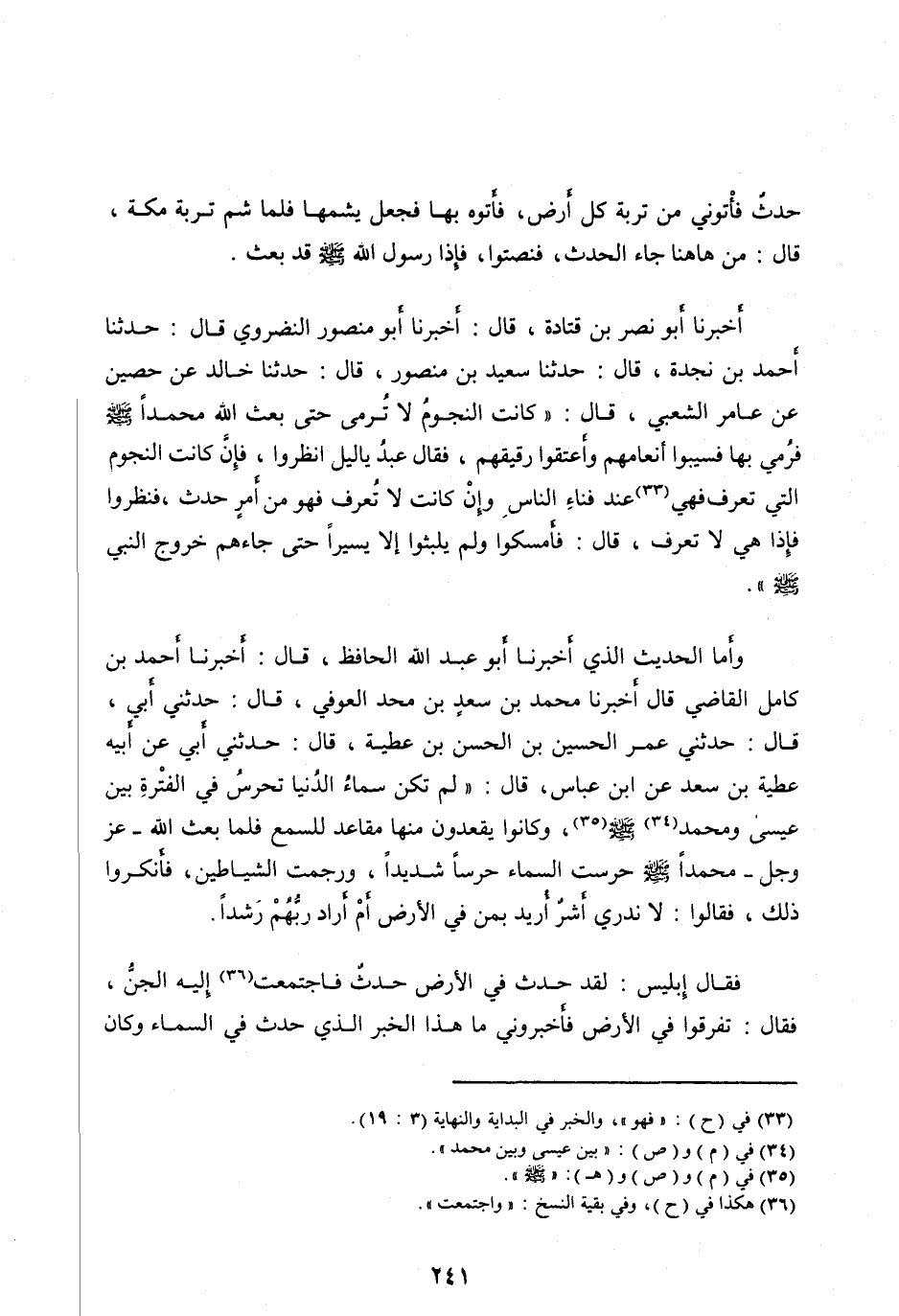 وَأَمَّا الْحَدِيثَ الَّذِي أَخْبَرَنَا أَبُو عَبْدِ اللهِ الْحَافِظُ، قَالَ: أَخْبَرَنَا أَحْمَدُ بْنُ كَامِلٍ الْقَاضِي قَالَ أَخْبَرَنَا مُحَمَّدُ بْنُ سَعْدِ بْنِ مَحَمَّدٍ الْعَوْفِيُّ، قَالَ: حَدَّثَنِي أَبِي، قَالَ: حَدَّثَنِي عمر الْحُسَيْنُ بْنُ الْحَسَنِ بْنِ عَطِيَّةَ، قَالَ: حَدَّثَنِي أَبِي عَنْ أَبِيهِ عَطِيَّةَ بْنِ سَعْدِ عَنِ ابْنِ عَبَّاسٍ، قَالَ: «لَمْ تَكُنْ سَمَاءُ الدُّنْيَا تُحْرَسُ فِي الْفَتْرَةِ بين عيسى وَمُحَمَّدٌ [ (34) ] صَلَّى اللهُ عَلَيْهِ وآله وَسَلَّمَ [ (35) ] ، وَكَانُوا يَقْعُدُونَ مِنْهَا مَقَاعِدَ لِلسَّمْعِ فَلَمَّا بَعَثَ اللهُ- عَزَّ وَجَلَّ- مُحَمَّدًا صَلَّى اللهُ عَلَيْهِ وآله وَسَلَّمَ حُرِسَتِ السَّمَاءُ حَرَسًا شَدِيدًا، وَرُجِمَتِ الشَّيَاطِينُ، فَأَنْكَرُوا ذَلِكَ، فَقَالُوا: لَا نَدْرِي أَشَرٌّ أُرِيدَ بِمَنْ فِي الْأَرْضِ أَمْ أَرَادَ رَبُّهُمْ رَشَدًا.