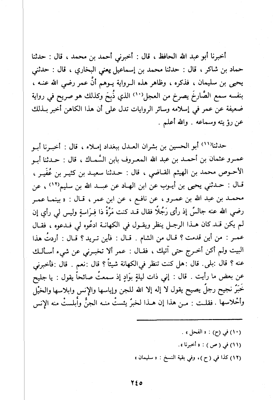 حَدَّثَنَا [ (11) ] أَبُو الْحُسَيْنِ بْنُ بِشْرَانَ الْعَدْلُ بِبَغْدَادَ إِمْلَاءً، قَالَ: أَخْبَرَنَا أَبُو عَمْرٍو عُثْمَانُ بْنُ أَحْمَدَ بْنِ عَبْدِ اللهِ الْمَعْرُوفُ بِابْنِ السَّمَّاكِ، قَالَ: حَدَّثَنَا أَبُو الْأَحْوَصِ مُحَمَّدُ بْنُ الْهَيْثَمِ الْقَاضِي، قَالَ: حَدَّثَنَا سَعِيدُ بْنُ كَثِيرِ بْنِ عُفَيْرٍ، قَالَ: حَدَّثَنِي يَحْيَى بْنُ أَيُّوبَ عَنِ ابْنِ الْهَادِ عَنْ عَبْدِ اللهِ بْنِ سُلَيْمٍ [ (12) ] ، عَنْ مُحَمَّدِ بْنِ عَبْدِ اللهِ بْنِ عَمْرٍو، عَنْ نَافِعٍ، عَنِ ابْنِ عُمَرَ، قَالَ: «بَيْنَمَا عُمَرُ رَضِيَ اللهُ عَنْهُ جَالِسٌ إِذْ رَأَى رَجُلًا فَقَالَ قَدْ كُنْتُ مَرَّةً ذَا فِرَاسَةٍ وَلَيْسَ لِي رَأْيٌ إِنْ لَمْ يَكُنْ قَدْ كَانَ هَذَا الرَّجُلُ يَنْظُرُ وَيَقُولُ فِي الْكِهَانَةِ ادْعُوهُ لِي فَدَعَوْهُ، فَقَالَ عُمَرُ: مِنْ أَيْنَ قَدِمْتَ؟ قَالَ مِنَ الشَّامِ. قَالَ: فَأَيْنَ تُرِيدُ؟ قَالَ: أَرَدْتُ هَذَا الْبَيْتَ وَلَمْ أَكُنْ أَخْرَجُ حَتَّى آتِيَكَ، فَقَالَ: عُمَرُ أَلَا تُخْبِرُنِي عَنْ شَيْءٍ أَسْأَلُكَ عَنْهُ؟ قَالَ: بَلَى. قَالَ: هَلْ كُنْتَ تَنْظُرُ فِي الْكِهَانَةِ شَيْئًا؟ قَالَ: نَعَمْ. قَالَ: فَأَخْبِرْنِي عَنْ بَعْضِ مَا رَأَيْتَ. قَالَ: إِنِّي ذَاتَ لَيْلَةٍ بِوَادٍ إِذْ سَمِعْتُ صَائِحًا يَقُولُ: يَا جَلِيحْ خَبَرَ نَجِيحْ رَجُلٌ يَصِيحْ يَقُولُ لَا إِلَهَ إِلَّا اللهُ لِلْجِنِّ وَإِيَاسِهَا وَالْإِنْسِ وَإِبْلَاسِهَا وَالْخَيْلِ وَأَحْلَاسِهَا. فَقُلْتُ: مَنْ هَذَا إِنَّ هَذَا لَخَبَرٌ يَئِسَتْ مِنْهُ الْجِنُّ وَأَبْلَسَتْ منه الإنس
