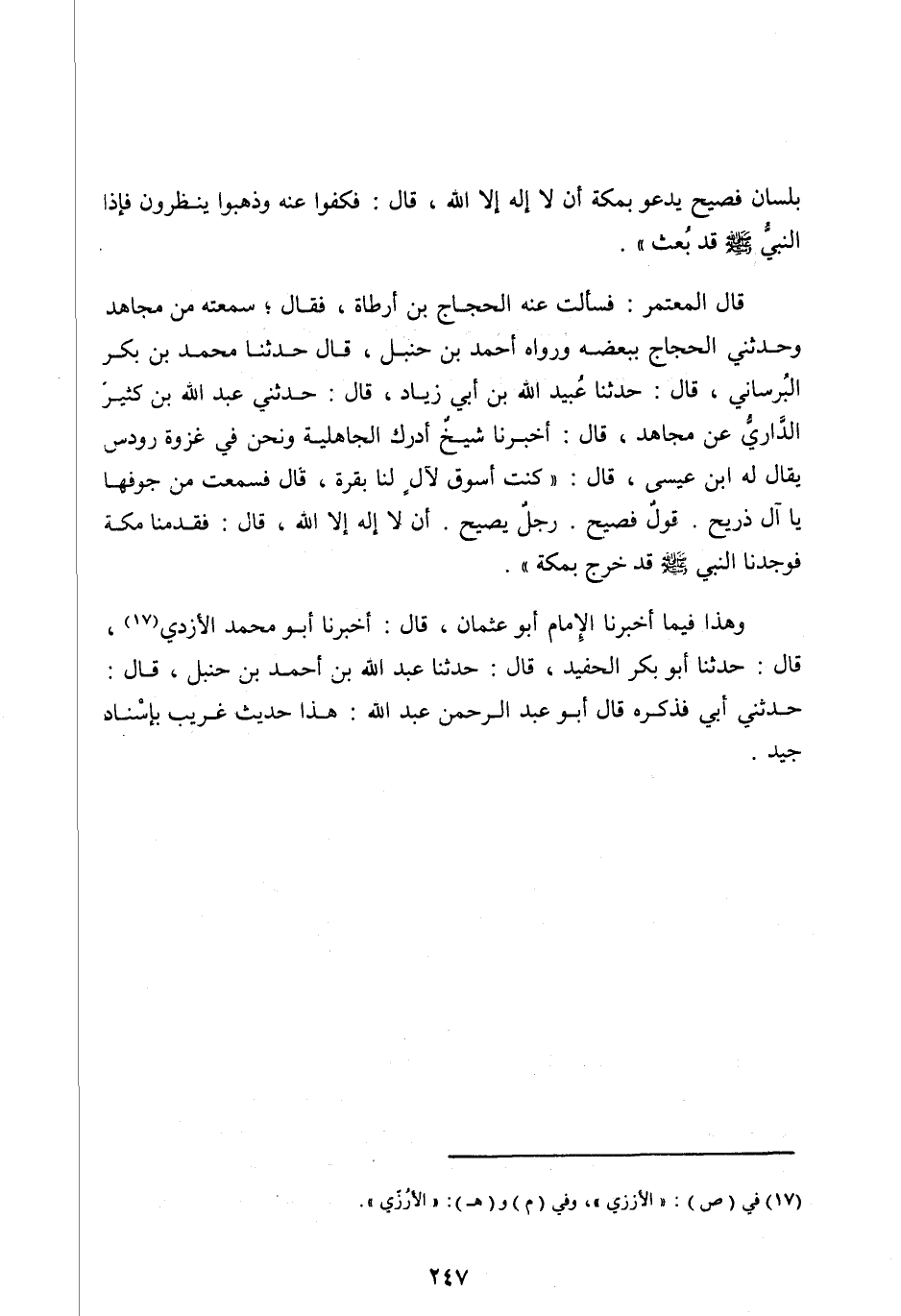 قَالَ الْمُعْتَمِرُ: فَسَأَلْتُ عَنْهُ الْحَجَّاجَ بْنَ أَرْطَأَةَ، فَقَالَ، سَمِعْتُهُ مِنْ مُجَاهِدٍ وَحَدَّثَنِي الْحَجَّاجُ بِبَعْضِهِ وَرَوَاهُ أَحْمَدُ بْنُ حَنْبَلٍ، قَالَ حَدَّثَنَا مُحَمَّدُ بْنُ بَكْرٍ الْبُرْسَانِيُّ، قَالَ: حَدَّثَنَا عُبَيْدُ اللهِ بْنِ أَبِي زِيَادٍ، قَالَ: حَدَّثَنِي عَبْدُ اللهِ بْنُ كَثِيرٍ الدَّارِيُّ عَنْ مُجَاهِدٍ، قَالَ: أَخْبَرَنَا شَيْخٌ أَدْرَكَ الْجَاهِلِيَّةَ وَنَحْنُ فِي غَزْوَةِ رُودِسَ يُقَالُ لَهُ ابْنُ عِيسَى، قَالَ: «كُنْتُ أَسُوقُ لِآلٍ لَنَا بَقَرَةً، قَالَ فَسَمِعْتُ مِنَ جَوْفِهَا يَا آلَ ذَرِيحْ. قَوْلٌ فَصِيحْ. رَجُلٌ يَصِيحْ. أَنْ لَا إِلَهَ إِلَّا اللهُ، قَالَ: فَقَدِمْنَا مَكَّةَ فَوَجَدْنَا النَّبِيَّ صَلَّى اللهُ عليه وآله وَسَلَّمَ قَدْ خَرَجَ بِمَكَّةَ» .