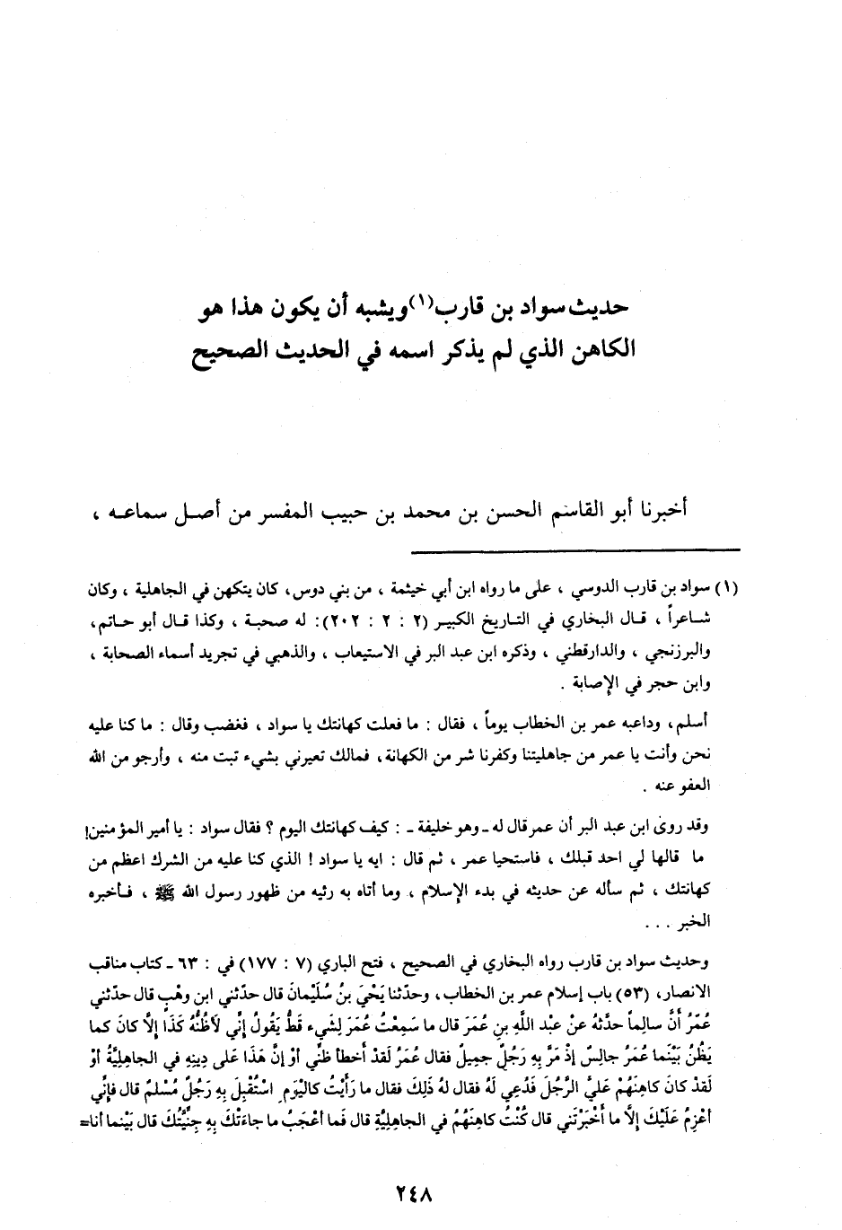 حَدِيثُ سَوَادِ بْنِ قَارِبٍ [ (1) ] وَيُشْبِهُ أَنْ يَكُونَ هَذَا هُوَ الْكَاهِنُ الَّذِي لَمْ يُذْكَرِ اسْمُهُ فِي الْحَدِيثِ الصَّحِيحِ