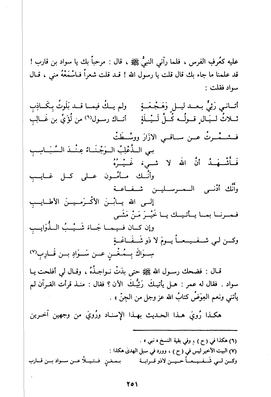 فَلَمَّا رَآنِي النَّبِيُّ صَلَّى اللهُ عليه وآله وَسَلَّمَ، قَالَ: مَرْحَبًا بِكَ يَا سَوَادُ بْنَ قَارِبٍ! قَدْ عَلِمْنَا مَا جَاءَ بِكَ قَالَ قُلْتُ يَا رَسُولَ اللهِ! قَدْ قُلْتُ شِعْرًا فَاسْمَعْهُ مِنِّي،