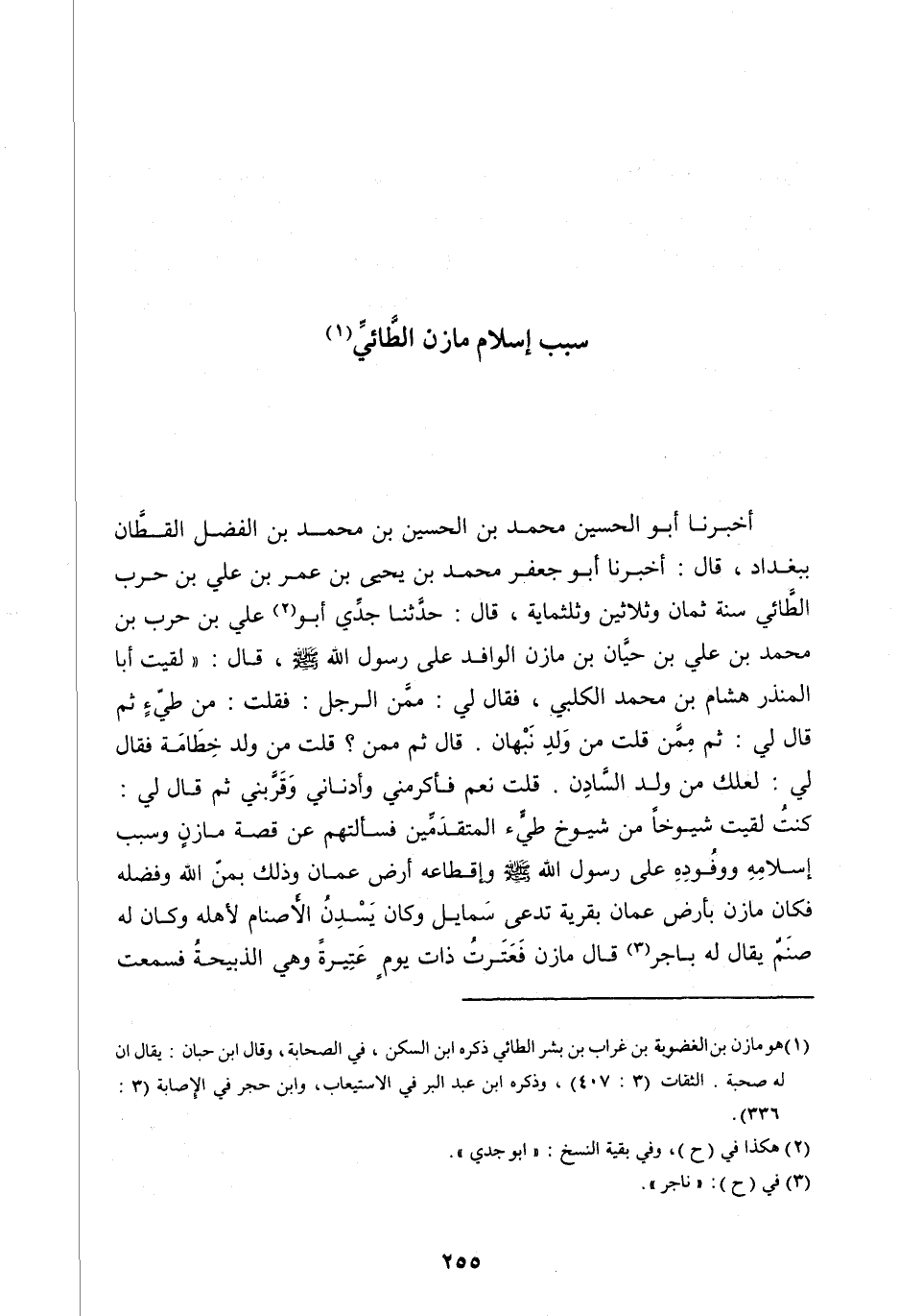 أَخْبَرَنَا أَبُو الْحُسَيْنِ مُحَمَّدُ بْنُ الْحُسَيْنِ بْنِ مُحَمَّدِ بْنِ الْفَضْلِ الْقَطَّانُ بِبَغْدَادَ، قَالَ: أَخْبَرَنَا أَبُو جَعْفَرٍ مُحَمَّدُ بْنُ يَحْيَى بْنِ عُمَرَ بْنِ عَلِيِّ بْنِ حَرْبٍ الطَّائِيُّ سَنَةَ ثَمَانٍ وَثَلَاثِينَ وثَلَاثِمِائَةٍ، قَالَ: حَدَّثَنَا جَدِّي أَبُو [ (2) ] عَلِيِّ بْنُ حَرْبِ بْنِ مُحَمَّدِ بْنِ عَلِيِّ بْنِ حَيَّانَ بْنِ مَازِنٍ الْوَافِدُ عَلَى رَسُولِ اللهِ صَلَّى اللهُ عليه وآله وَسَلَّمَ، قَالَ: «لَقِيتُ أَبَا الْمُنْذِرِ هِشَامَ بْنَ مُحَمَّدٍ الْكَلْبِيَّ، فَقَالَ لِي: مِمَّنِ الرَّجُلُ: فَقُلْتُ: مِنْ طيّء ثُمَّ قَالَ لِي: ثُمَّ مِمَّنْ قُلْتُ مِنْ وَلَدِ نَبْهَانَ. قَالَ ثُمَّ مِمَّنْ؟ قُلْتُ مِنْ وَلَدِ خِطَامَةَ فَقَالَ لِي: لَعَلَّكَ مِنْ وَلَدِ السَّادِنِ. قُلْتُ نَعَمْ فَأَكْرَمَنِي وَأَدْنَانِي وَقَرَّبَنِي ثُمَّ قَالَ لِي: