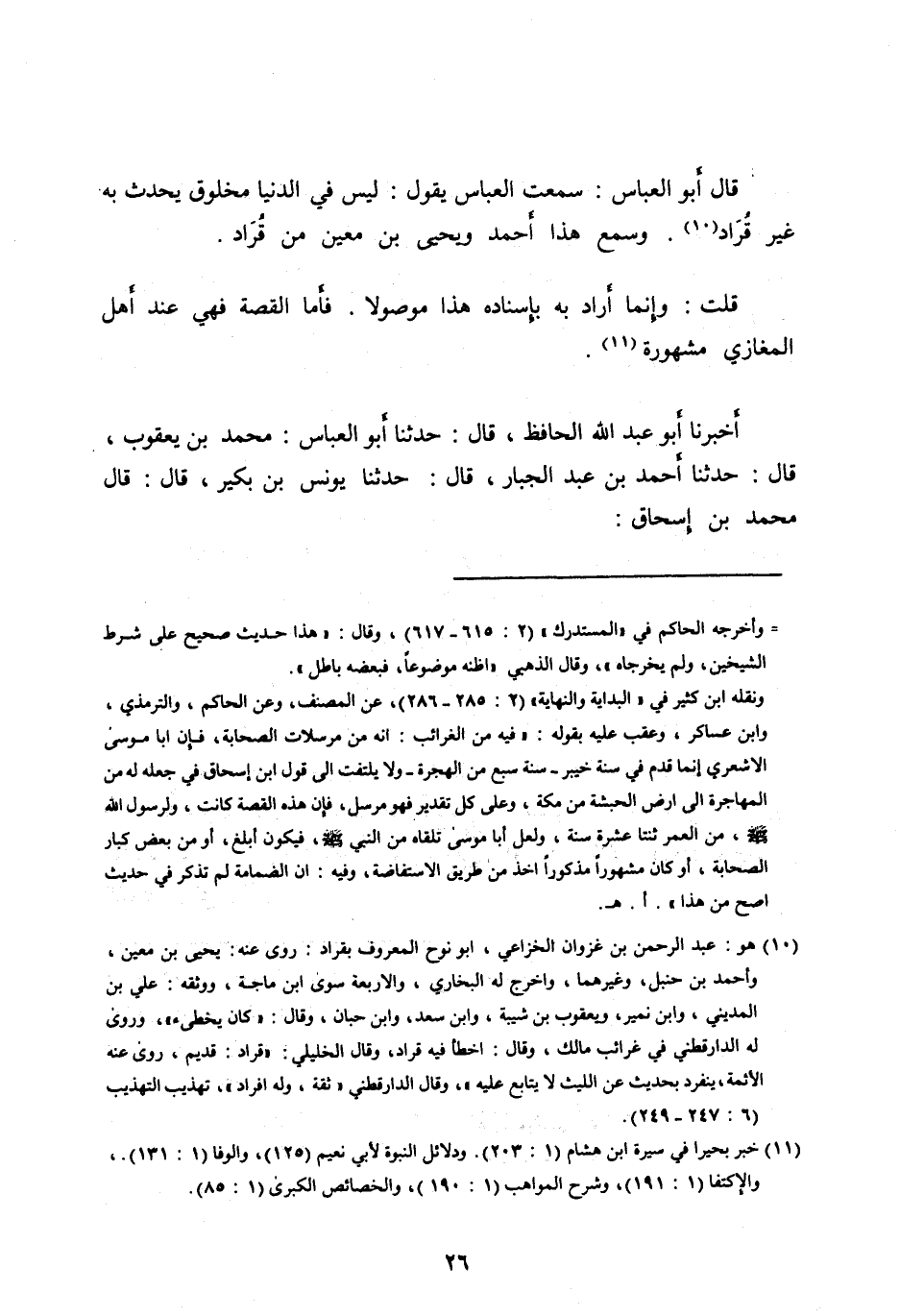 [ (10) ] هو: عبد الرحمن بن غزوان الخزاعي، ابو نوح المعروف بقراد: روى عنه: يحيى بن معين، وأحمد بن حنبل، وغيرهما، واخرج له البخاري، والاربعة سوى ابن ماجة، ووثقه: علي بن المديني، وابن نمير، ويعقوب بن شيبة، وابن سعد، وابن حبان، وقال: «كان يخطئ» ، وروى له الدارقطني في غرائب مالك، وقال: اخطأ فيه قراد، وقال الخليلي: «قراد: قديم، روى عنه الأئمة، ينفرد بحديث عن الليث لا يتابع عليه» ، وقال الدارقطني «ثقة، وله افراد» ، تهذيب التهذيب (6: 247- 249) .